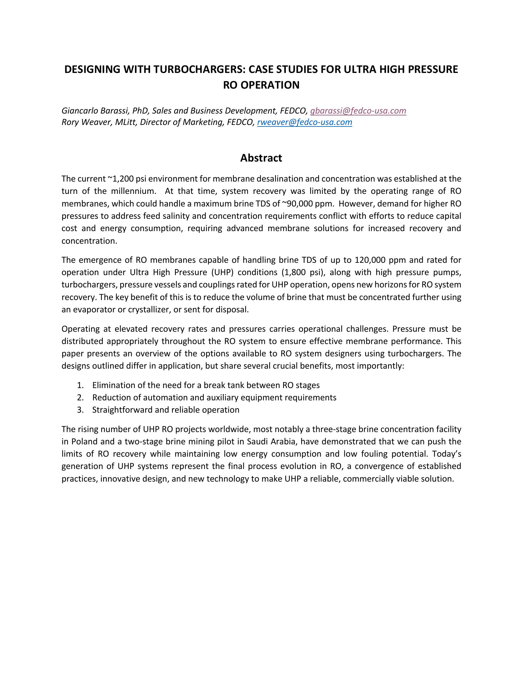 The current ~1,200 psi environment for membrane desalination and concentration was established at the turn of the millennium. At that time, system recovery was limited by the operating range of RO membranes, which could handle a maximum brine TDS of ~90,000 ppm. However, demand for higher RO pressures to address feed salinity and concentration requirements conflict with efforts to reduce capital cost and energy consumption, requiring advanced membrane solutions for increased recovery and concentration. The emergence of RO membranes capable of handling brine TDS of up to 120,000 ppm and rated for operation under Ultra High Pressure (UHP) conditions (1,800 psi), along with high pressure pumps, turbochargers, pressure vessels and couplings rated for UHP operation, opens new horizons for RO system recovery. The key benefit of this is to reduce the volume of brine that must be concentrated further using an evaporator or crystallizer, or sent for disposal. Operating at elevated recovery rates and pressures carries operational challenges. Pressure must be distributed appropriately throughout the RO system to ensure effective membrane performance. This paper presents an overview of the options available to RO system designers using turbochargers. The designs outlined differ in application, but share several crucial benefits, most importantly: 1. Elimination of the need for a break tank between RO stages 2. Reduction of automation and auxiliary equipment requirements 3. Straightforward and reliable operation. The rising number of UHP RO projects worldwide, most notably a three-stage brine concentration facility in Poland and a two-stage brine mining pilot in Saudi Arabia, have demonstrated that we can push the limits of RO recovery while maintaining low energy consumption and low fouling potential. Todayís generation of UHP systems represent the final process evolution in RO, a convergence of established practices, innovative design, and new technology to make UHP a reliable, commercially viable solution.