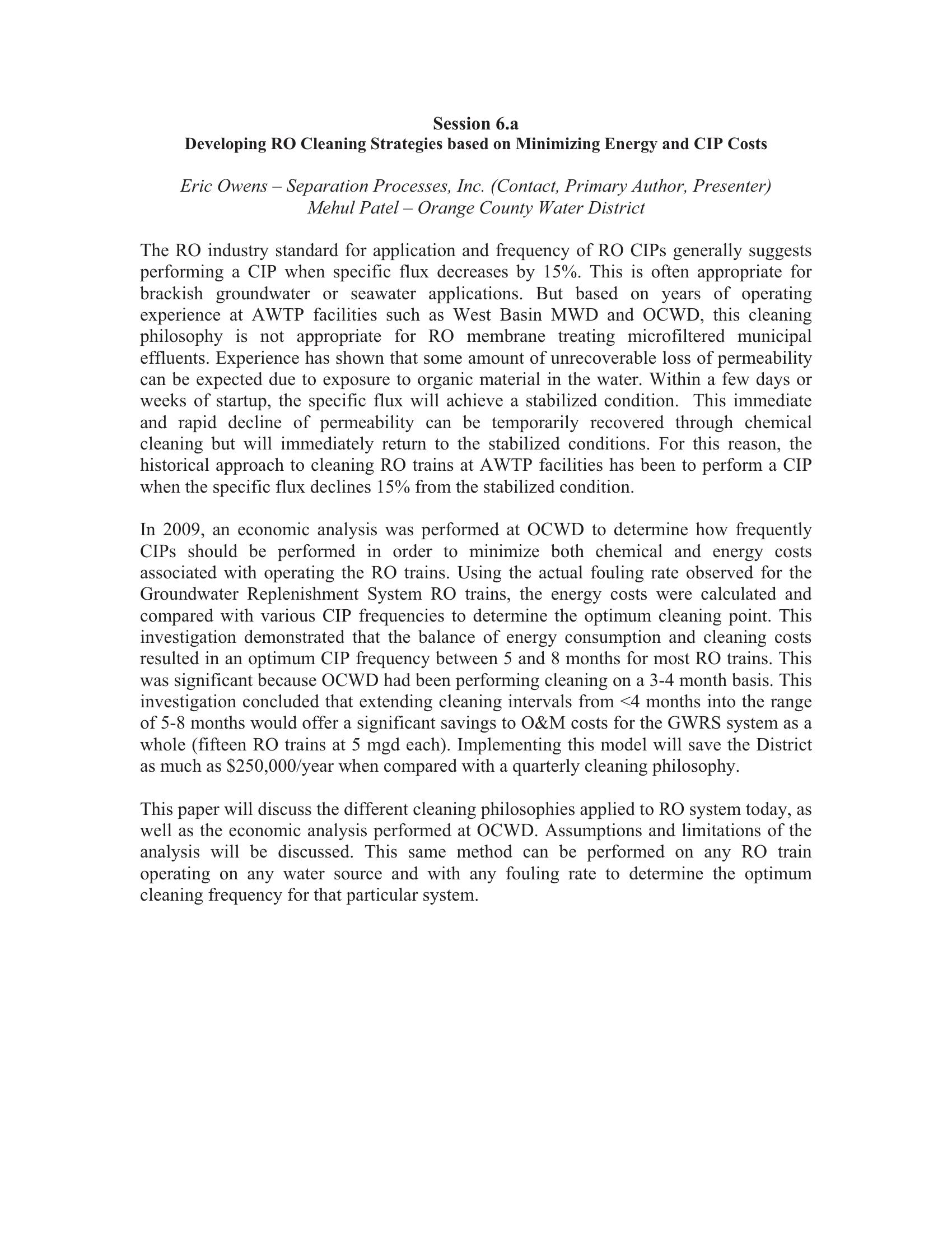 This paper documents an economic analysis that was performed to determine the most effective cleaning interval for the RO membrane in the OCWD GWR System. This system consists of 15 individual 5 million gallon per day rated RO units. The purpose of the analysis was to determine the optimum interval of operation between CIP cleanings in a year, based on the energy required to operate each individual train. Most individual trains had calculated optimum cleaning intervals falling into two categories – 5 month intervals and 8 month intervals. This assessment was based on the current condition and rate of fouling for each of the trains. The results of the analysis are dependent on several variables that could change over time. As a consequence, the investigation needs to be repeated if a significant change in the fouling rate is observed. Just prior to performing this analysis, OCWD had been performing cleanings with a frequency of <4 months. From this investigation, the optimum cleaning interval is greater than 5 months, and extending cleaning intervals from <4 months into the range of 5-8 months offers a significant savings to O&M costs for the GWRS system as a whole. As a comparison, implementing this model is anticipated to save the District as much as $250,000 over a quarterly cleaning philosophy. Similarly, the District would save up to $118,000 over a four month cleaning interval.
