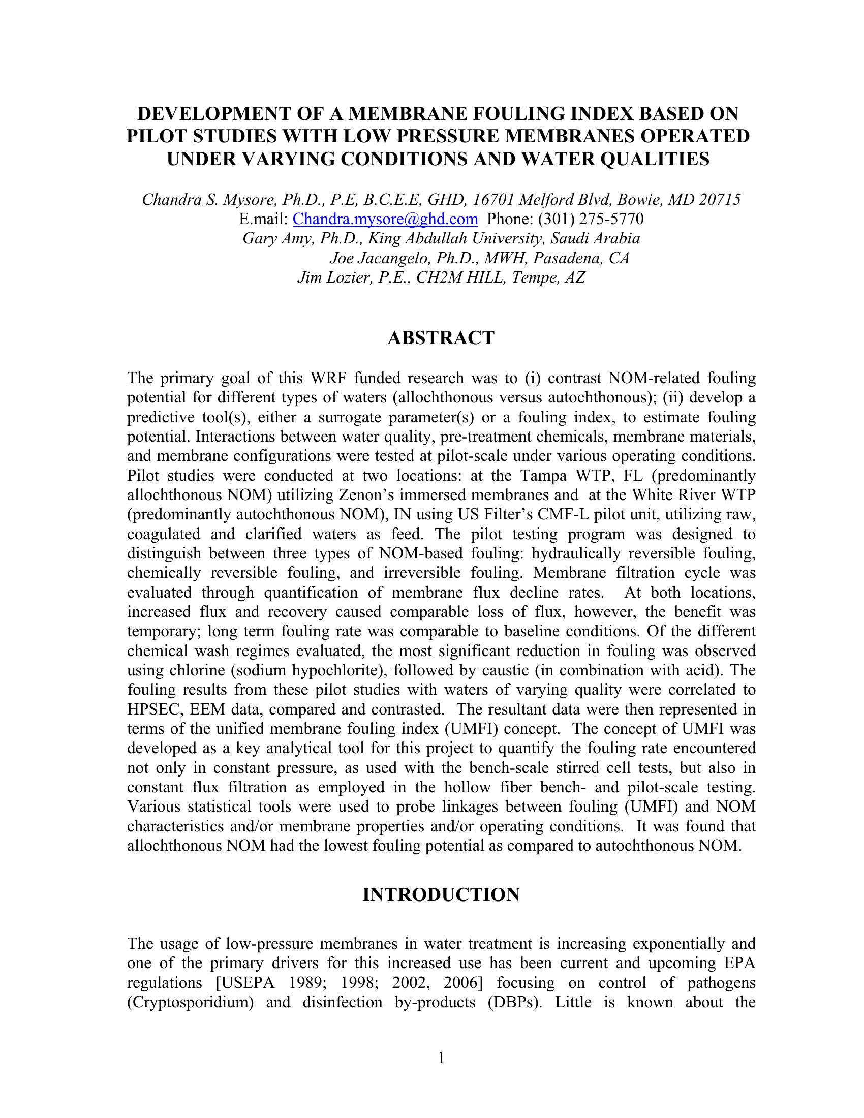 DEVELOPMENT OF A MEMBRANE FOULING INDEX BASED ON PILOT STUDIES WITH LOW PRESSURE MEMBRANES OPERATED UNDER VARYING CONDITIONS AND WATER QUALITIES.The primary goal of this WRF funded research was to (i) contrast NOM-related fouling potential for different types of waters (allochthonous versus autochthonous); (ii) develop a predictive tool(s), either a surrogate parameter(s) or a fouling index, to estimate fouling potential. Interactions between water quality, pre-treatment chemicals, membrane materials, and membrane configurations were tested at pilot-scale under various operating conditions.