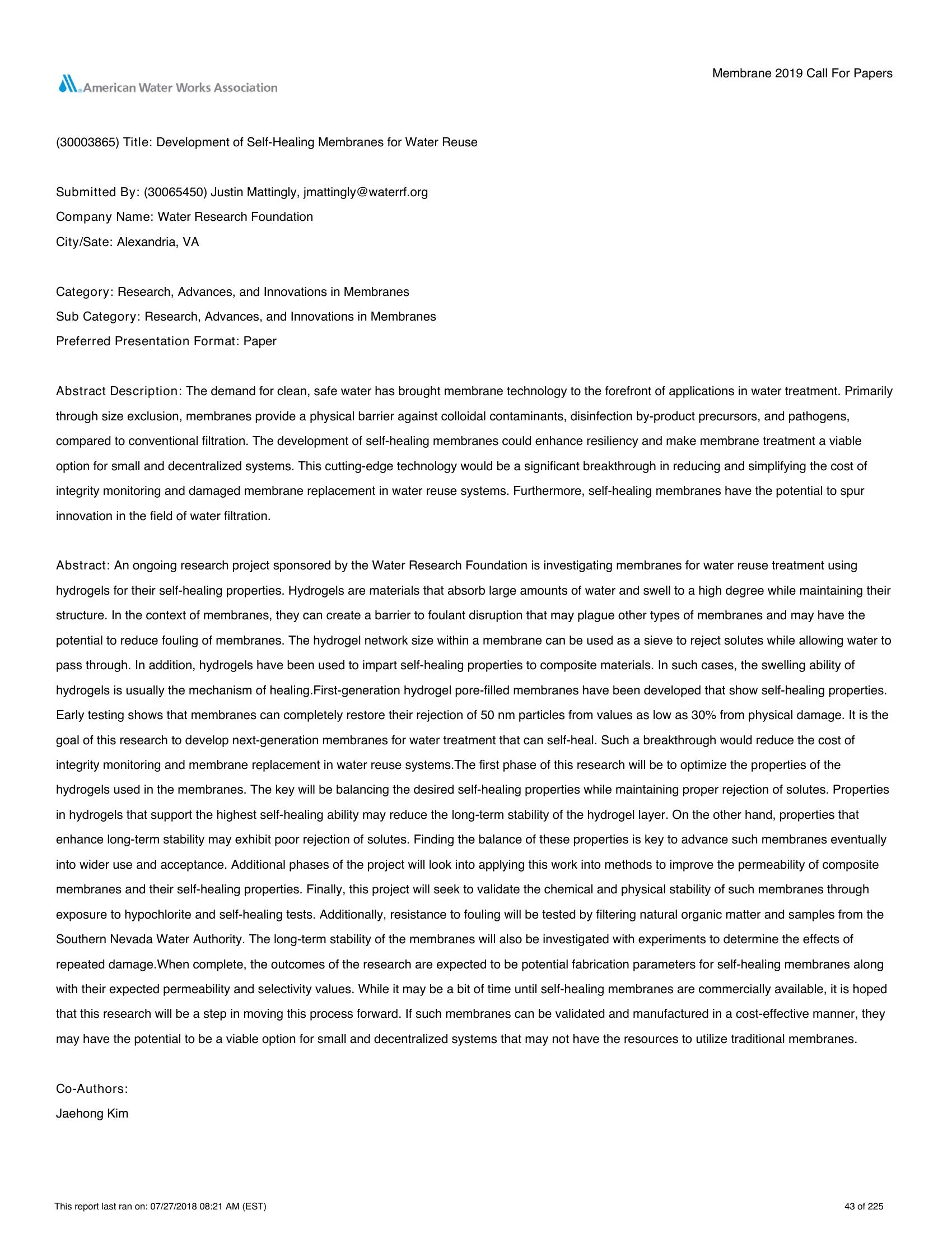 The demand for clean, safe water has brought membrane technology to the forefront of applications in water treatment. Primarily through size exclusion, membranes provide a physical barrier against colloidal contaminants, disinfection by-product precursors, and pathogens, compared to conventional filtration. The development of self-healing membranes could enhance resiliency and make membrane treatment a viable option for small and decentralized systems. This cutting-edge technology would be a significant breakthrough in reducing and simplifying the cost of integrity monitoring and damaged membrane replacement in water reuse systems. Furthermore, self-healing membranes have the potential to spur innovation in the field of water filtration.
