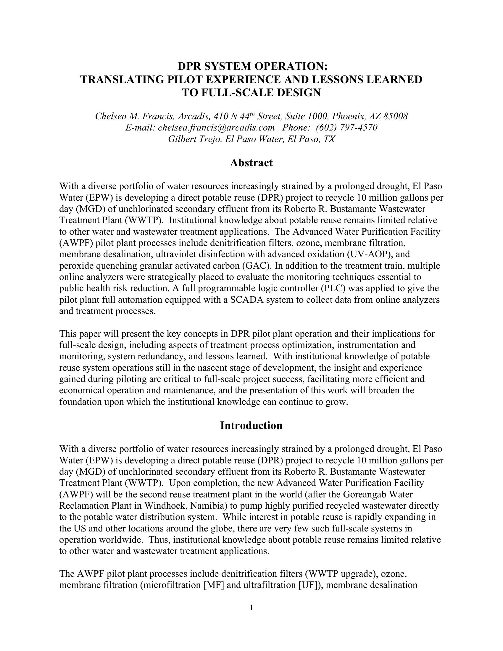 KeywordsMembrane, Design, Operations, Pilot, Reuse