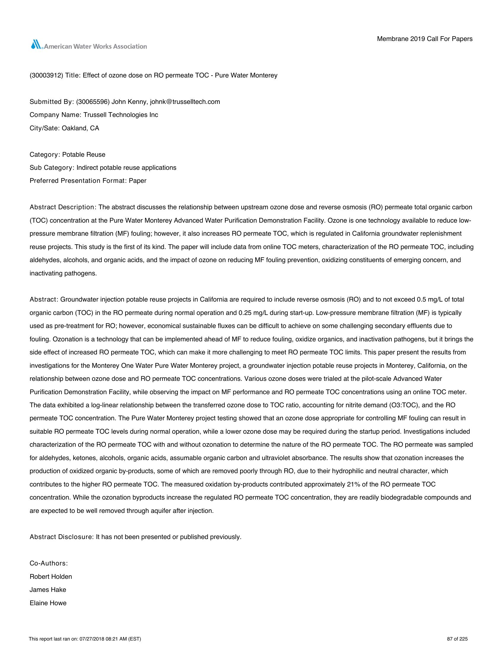 The abstract discusses the relationship between upstream ozone dose and reverse osmosis (RO) permeate total organic carbon (TOC) concentration at the Pure Water Monterey Advanced Water Purification Demonstration Facility. Ozone is one technology available to reduce lowpressure membrane filtration (MF) fouling; however, it also increases RO permeate TOC, which is regulated in California groundwater replenishment reuse projects. This study is the first of its kind. The paper will include data from online TOC meters, characterization of the RO permeate TOC, including aldehydes, alcohols, and organic acids, and the impact of ozone on reducing MF fouling prevention, oxidizing constituents of emerging concern, and inactivating pathogens.