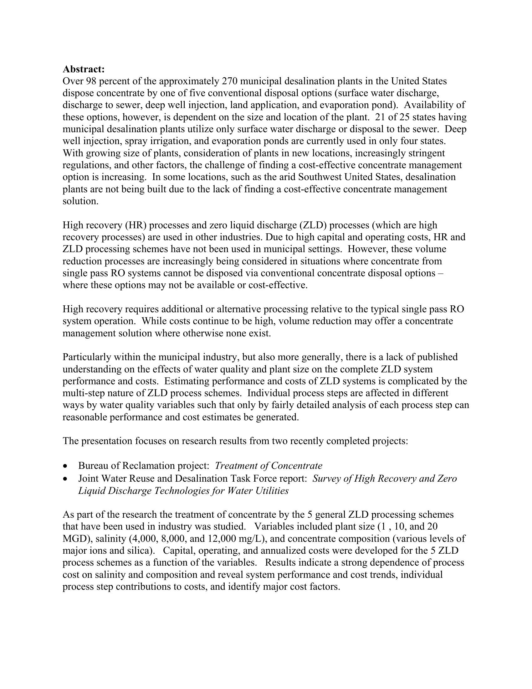 This presentation focuses on research results from two projects, the Bureau of Reclamation project: Treatment of Concentrate and the Joint Water Reuse and Desalination Task Force report: Survey of High Recovery and Zero Liquid Discharge Technologies for Water Utilities. As part of the research the treatment of concentrate by the 5 general ZLD processing schemes that have been used in the industry were studied. Variables included plant size (1, 10, and 20MGD), salinity (4,000, 8,000, and 12,000 mg/L), and concentrate composition (various levels of major ions and silica). Capital, operating, and annualized costs were developed for the 5 ZLD process schemes as a function of the variables. Results indicate a strong dependence of process cost on salinity and composition and reveal system performance and cost trends, individual process step contributions to costs, and identify major cost factors.