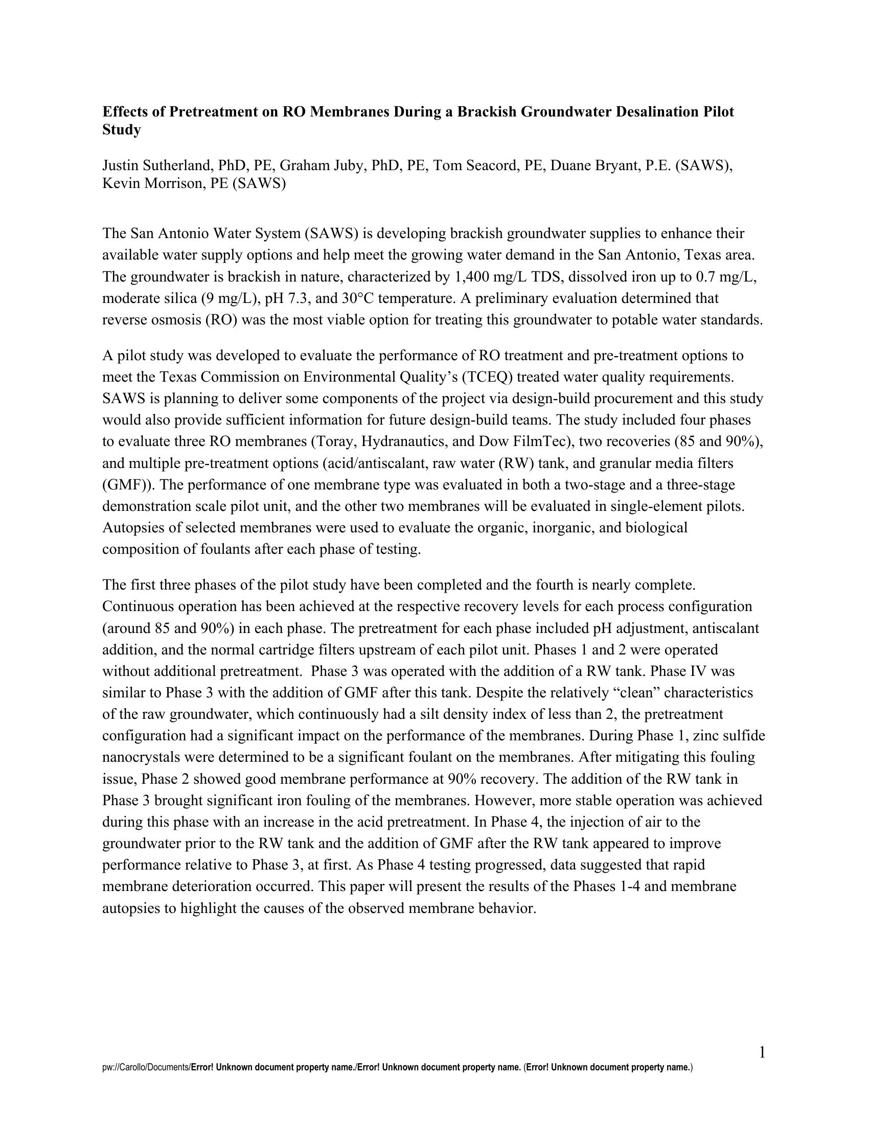 The San Antonio Water System (SAWS) launched a feasibility assessment as part of its Brackish Groundwater Desalination (BGD) Project. The purpose of the assessment was to evaluate the potential of developing brackish groundwater (1,000 – 3,000 mg/l total dissolved solids) from the Lower Wilcox Aquifer as an additional water supply source to the existing portfolio of water resources. A pilot study was developed to evaluate the performance of RO treatment and pre-treatment options to meet the Texas Commission on Environmental Quality’s (TCEQ) treated water quality requirements. The study included four phases to evaluate three brackish water RO membranes (Toray (TM-710), Hydranautics (ESPA2), and Dow FilmTec (BW4030)), two recoveries (85 and 90%), and multiple pre-treatment options (acid/antiscalant, raw water (RW) tank, and granular media filters (GMF)).