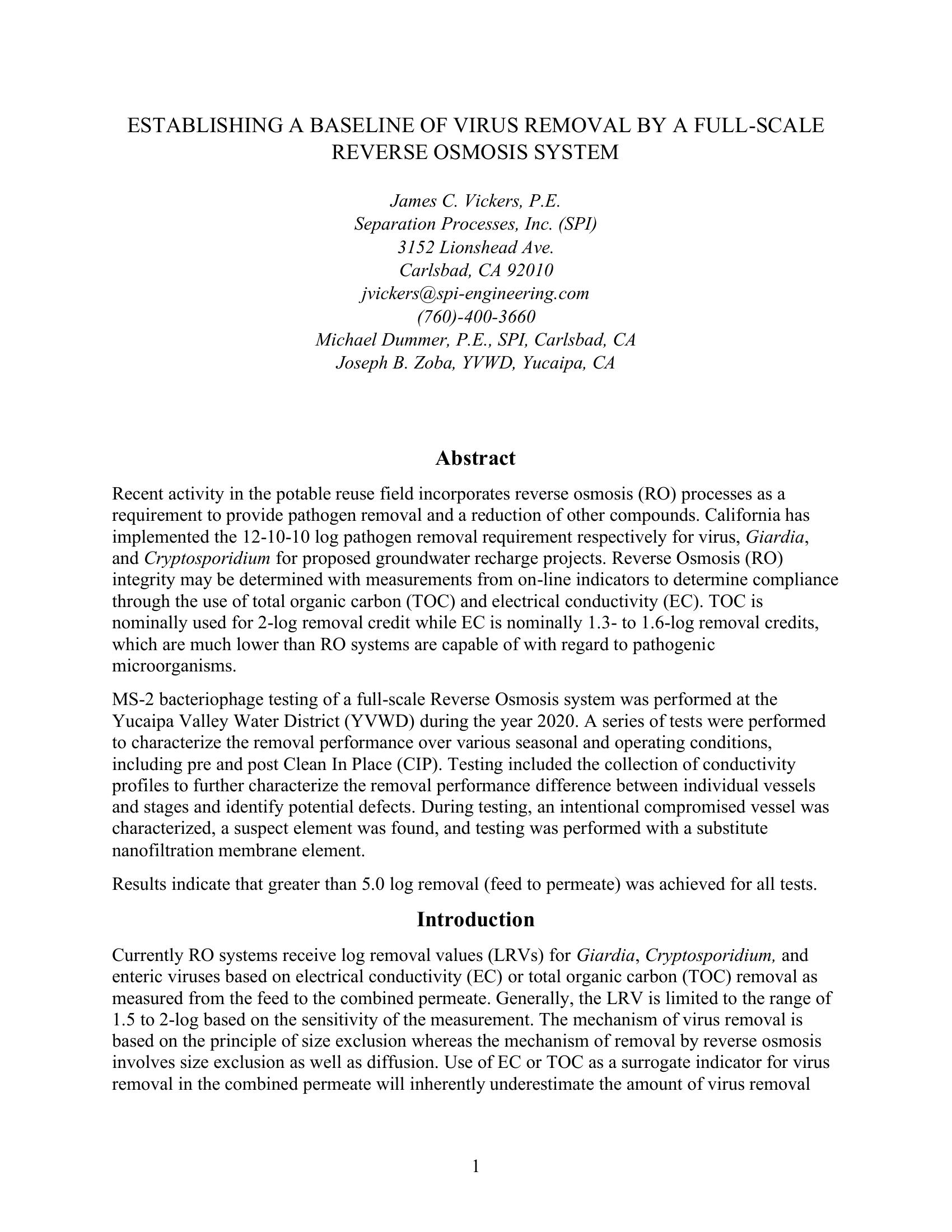 Recent activity in the potable reuse field incorporates reverse osmosis (RO) processes as a requirement to provide pathogen removal and a reduction of other compounds. California has implemented the 12-10-10 log pathogen removal requirement respectively for virus, Giardia, and Cryptosporidium for proposed groundwater recharge projects. Reverse Osmosis (RO) integrity may be determined with measurements from on-line indicators to determine compliance through the use of total organic carbon (TOC) and electrical conductivity (EC). TOC is nominally used for 2-log removal credit while EC is nominally 1.3- to 1.6-log removal credits, which are much lower than RO systems are capable of with regard to pathogenic microorganisms. MS-2 bacteriophage testing of a full-scale Reverse Osmosis system was performed at the Yucaipa Valley Water District (YVWD) during the year 2020. A series of tests were performed to characterize the removal performance over various seasonal and operating conditions, including pre and post Clean In Place (CIP). Testing included the collection of conductivity profiles to further characterize the removal performance difference between individual vessels and stages and identify potential defects. During testing, an intentional compromised vessel was characterized, a suspect element was found, and testing was performed with a substitute nanofiltration membrane element. Results indicate that greater than 5.0 log removal (feed to permeate) was achieved for all tests.