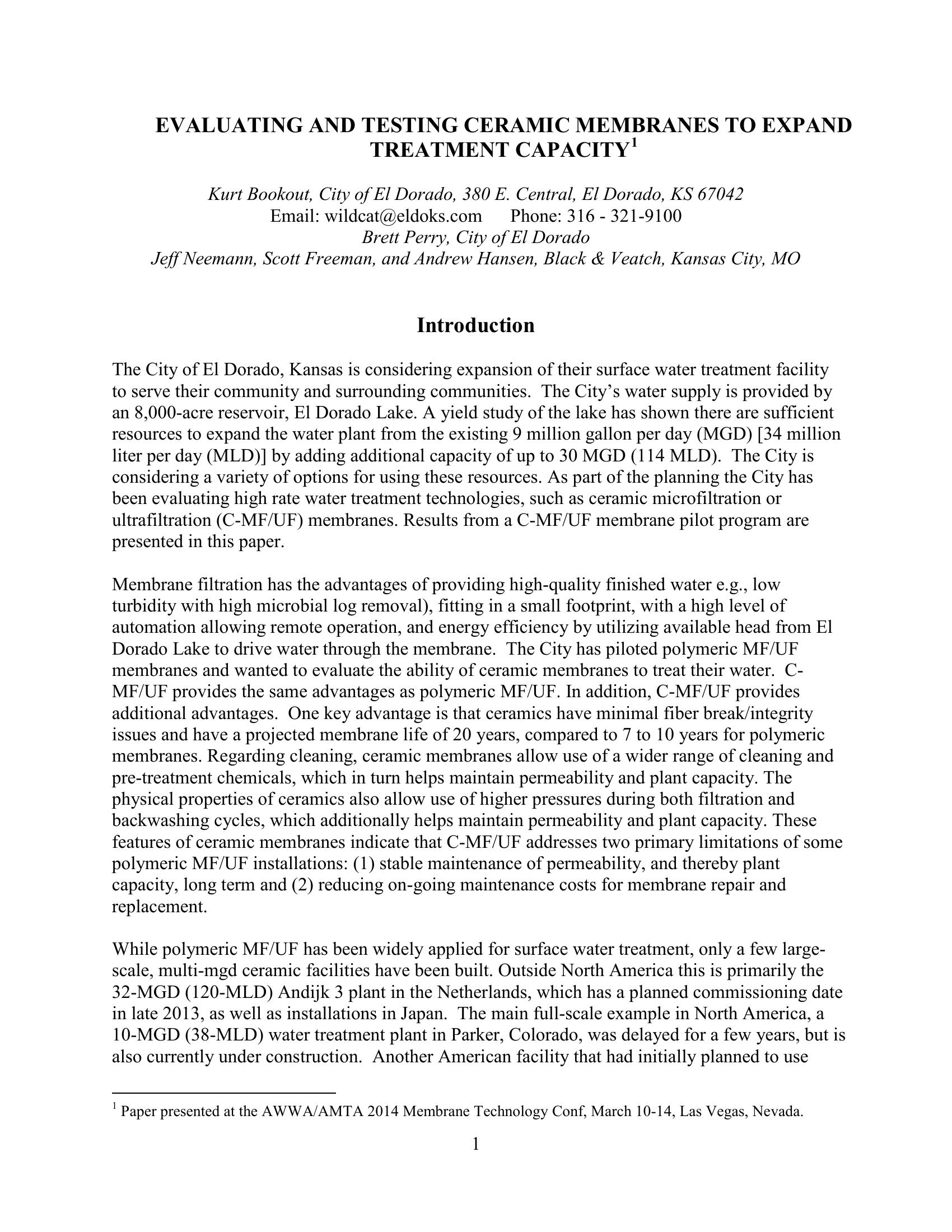 Results from the City of El Dorado?s (Kansas) pilot testing and information about the applicability of ceramic membranes are presented, as well as the capital and operating cost comparison of the polymeric and ceramic membrane alternatives. This paper and presentation benefit other utilities that are looking to expand or add capacity and are considering membrane filtration.