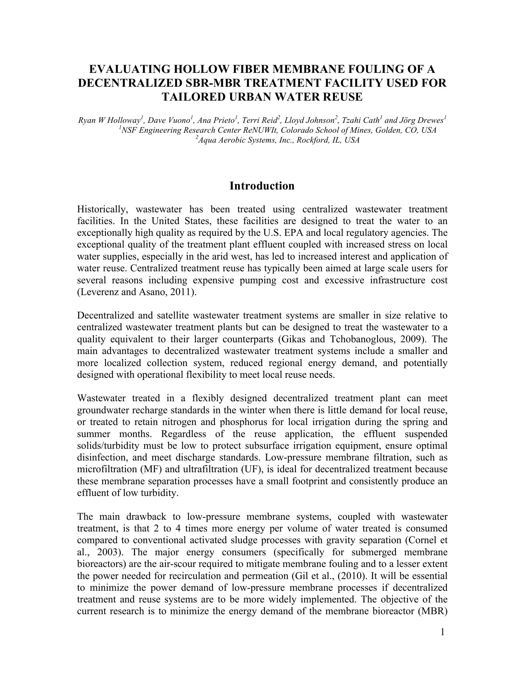 Evaluating System Performance of a Decentralized SBMBR Treatment Facility Used for Tailored Urban Water Reuse