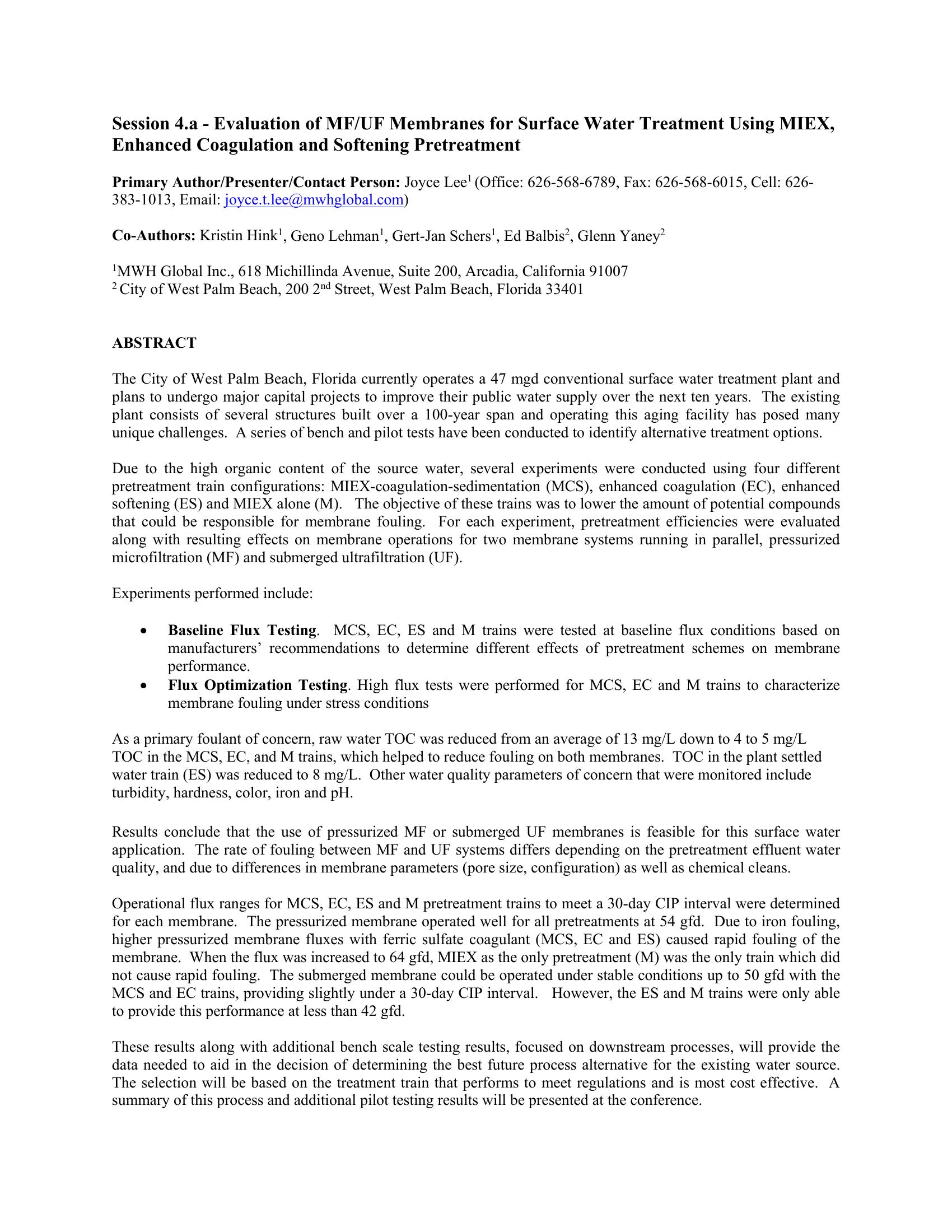 Pilot testing pre-treatment alternatives on a difficult to treat (i.e., high organics and taste & older) surface water was conducted. Testing trains included: 1. MIEX with coagulation and sedimentation; 2. Enhanced coagulation; 3. Enhanced softening and; 4. MIEX alone. Pilot testing included MF/UF treatment after the pretreatment. MIEX with coagulation and sedimentation provided the optimum pre treatment to minimize membrane fouling and was therefore recommended as the preferred treatment train for the updated facility.
