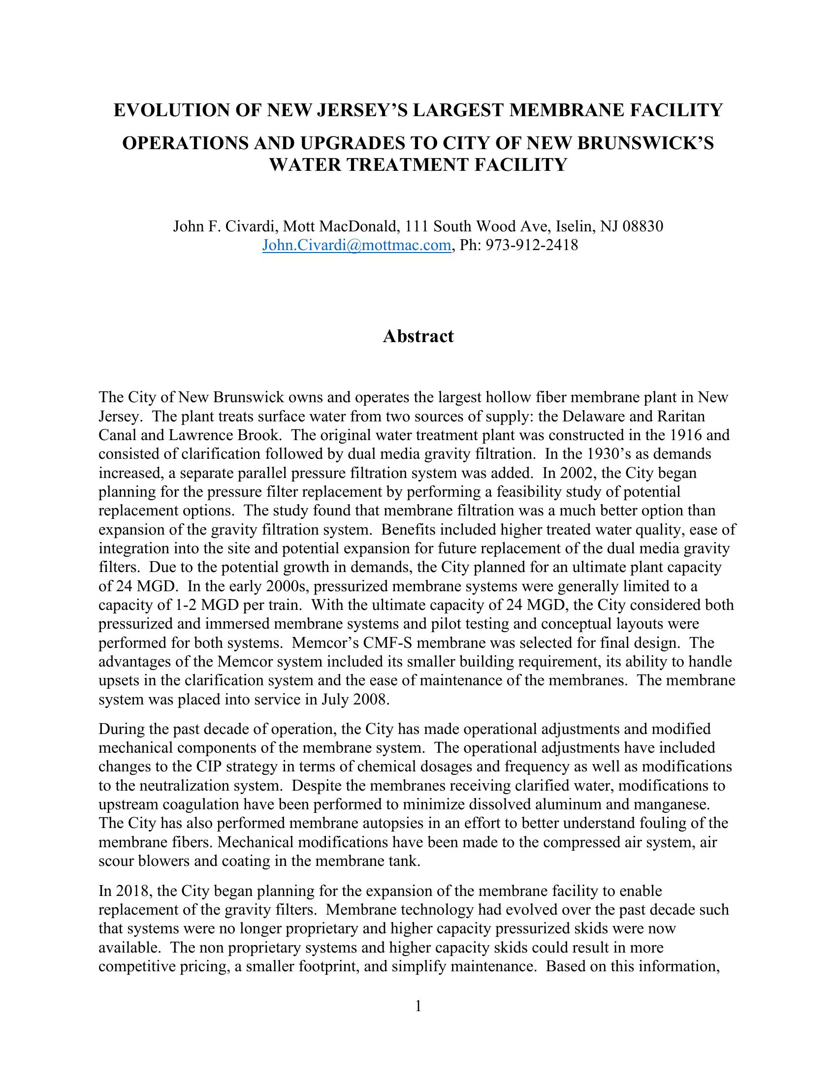 The City of New Brunswick owns and operates the largest hollow fiber membrane plant in New Jersey. The plant treats surface water from two sources of supply: the Delaware and Raritan Canal and Lawrence Brook. The original water treatment plant was constructed in the 1916 and consisted of clarification followed by dual media gravity filtration. In the 1930ís as demands increased, a separate parallel pressure filtration system was added. In 2002, the City began planning for the pressure filter replacement by performing a feasibility study of potential replacement options. The study found that membrane filtration was a much better option than expansion of the gravity filtration system. Benefits included higher treated water quality, ease of integration into the site and potential expansion for future replacement of the dual media gravity filters. Due to the potential growth in demands, the City planned for an ultimate plant capacity of 24 MGD. In the early 2000s, pressurized membrane systems were generally limited to a capacity of 1-2 MGD per train. With the ultimate capacity of 24 MGD, the City considered both pressurized and immersed membrane systems and pilot testing and conceptual layouts were performed for both systems. Memcorís CMF-S membrane was selected for final design. The advantages of the Memcor system included its smaller building requirement, its ability to handle upsets in the clarification system and the ease of maintenance of the membranes. The membrane system was placed into service in July 2008. During the past decade of operation, the City has made operational adjustments and modified mechanical components of the membrane system. The operational adjustments have included changes to the CIP strategy in terms of chemical dosages and frequency as well as modifications to the neutralization system. Despite the membranes receiving clarified water, modifications to upstream coagulation have been performed to minimize dissolved aluminum and manganese. The City has also performed membrane autopsies in an effort to better understand fouling of the membrane fibers. Mechanical modifications have been made to the compressed air system, air scour blowers and coating in the membrane tank. In 2018, the City began planning for the expansion of the membrane facility to enable replacement of the gravity filters. Membrane technology had evolved over the past decade such that systems were no longer proprietary and higher capacity pressurized skids were now available. The non proprietary systems and higher capacity skids could result in more competitive pricing, a smaller footprint, and simplify maintenance. Based on this information, the City initiated a comprehensive evaluation of membrane systems suitable for the expansion. The City expects to bid the plant expansion in early 2022. This paper will discuss the significant aspects of the design and operational phases of the project along with the improvements that have been made over the decade of operation.
