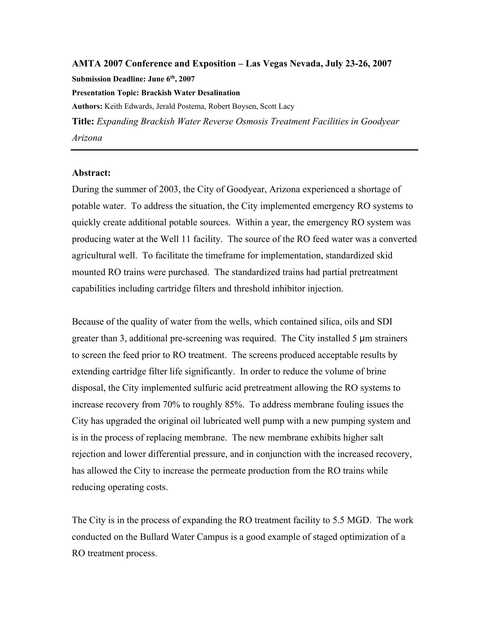 In 2003, the City of Goodyear, Arizona experienced a shortage of potable water and implemented the use of emergency RO systems to produce additional potable water from a converted agricultural well source. Standardized skid mounted RO trains were purchased with partial pretreatment capabilities including cartridge filters and threshold inhibitor injection. The project is an example of a staged optimization of a
