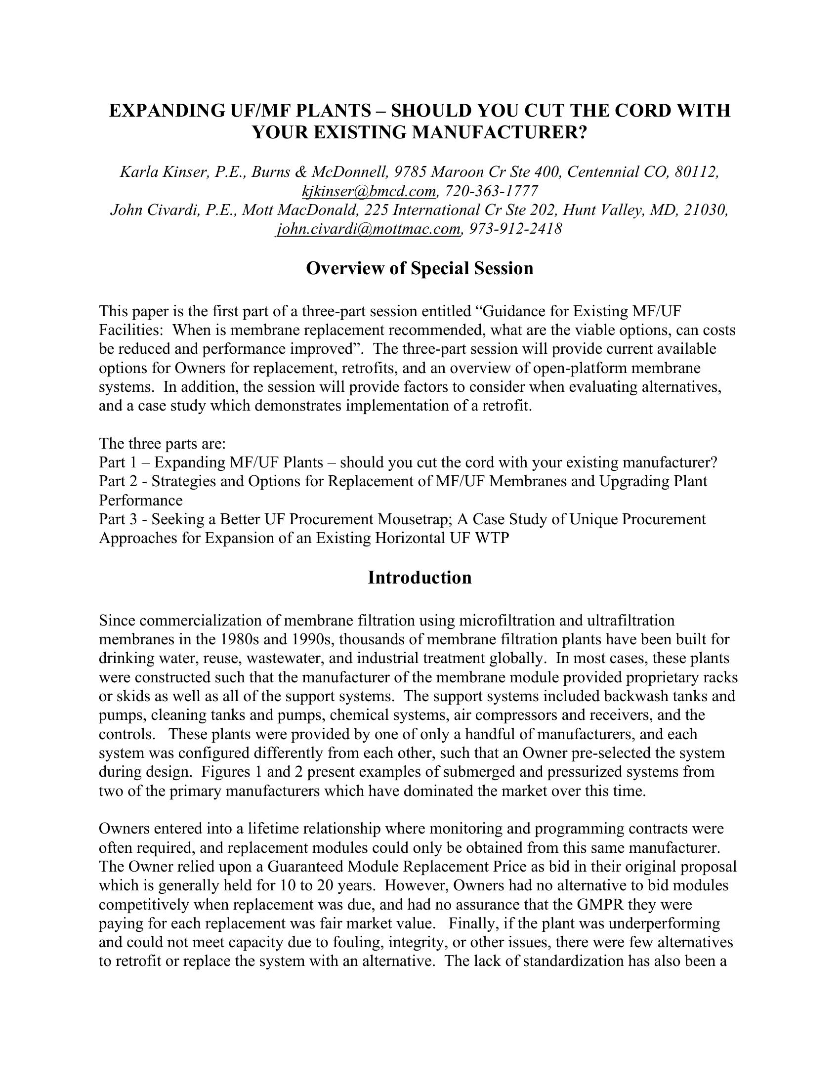 This paper is the first part of a three-part session entitled ìGuidance for Existing MF/UF Facilities: When is membrane replacement recommended, what are the viable options, can costs be reduced and performance improvedî. The three-part session will provide current available options for Owners for replacement, retrofits, and an overview of open-platform membrane systems. In addition, the session will provide factors to consider when evaluating alternatives, and a case study which demonstrates implementation of a retrofit. The three parts are: Part 1 ñ Expanding MF/UF Plants ñ should you cut the cord with your existing manufacturer? Part 2 – Strategies and Options for Replacement of MF/UF Membranes and Upgrading Plant Performance Part 3 – Seeking a Better UF Procurement Mousetrap; A Case Study of Unique Procurement Approaches for Expansion of an Existing Horizontal UF WTP