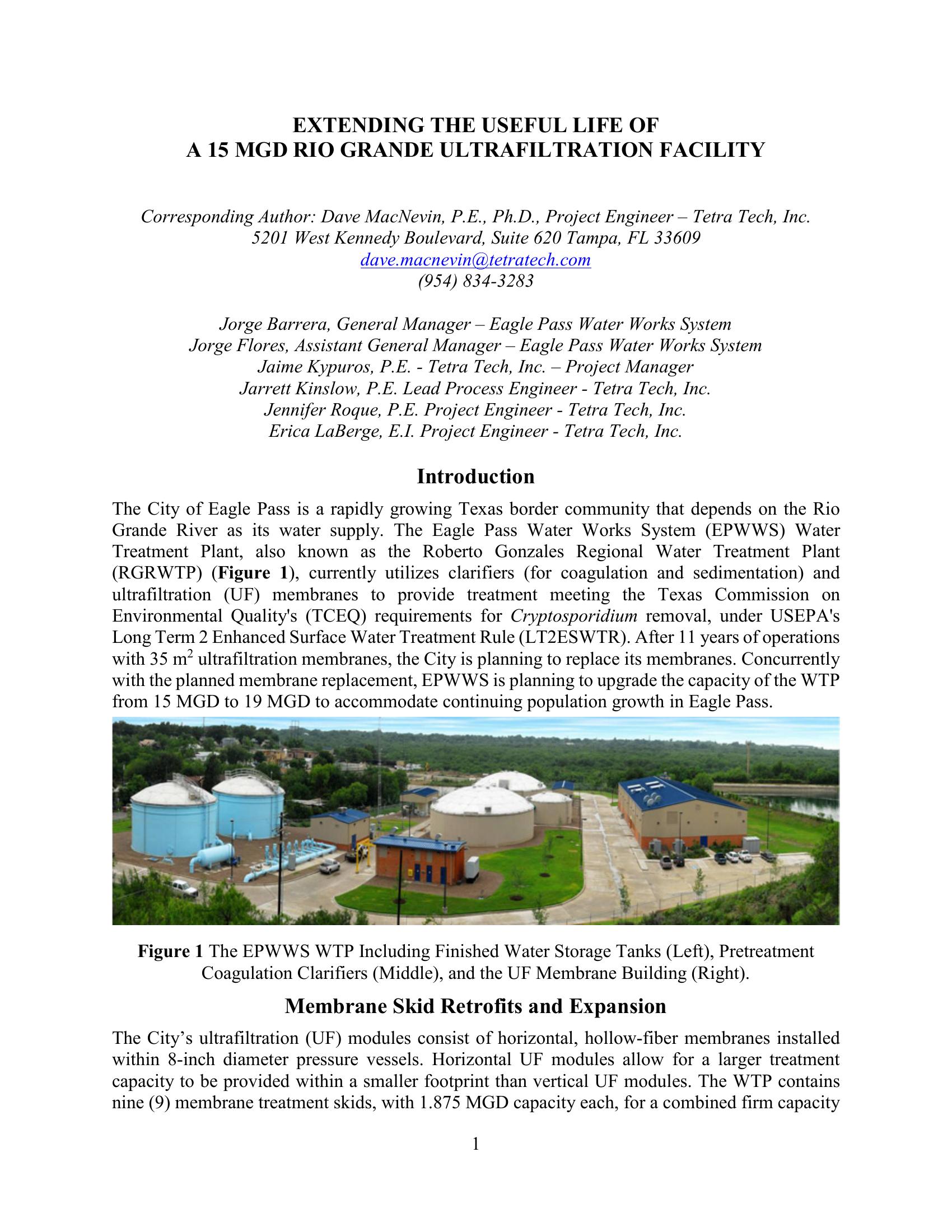 The City of Eagle Pass, Texas draws its water supply from the Rio Grande treating the river water through a 15 MGD ultrafiltration treatment plant. After 10 years of operations with 35m 2 ultrafiltration membranes, the City is planning to replace its membranes with a newer 40m 2 membrane model. This presentation will provide an update on Eagle Pass’s experience through the validation process, including the regulatory approach followed to obtaining TCEQ approval, direct integrity test methods (volume-based vs. pressure decay), demonstration testing, lessons learned, design of the retrofit, and operational implications of the membrane upgrade.