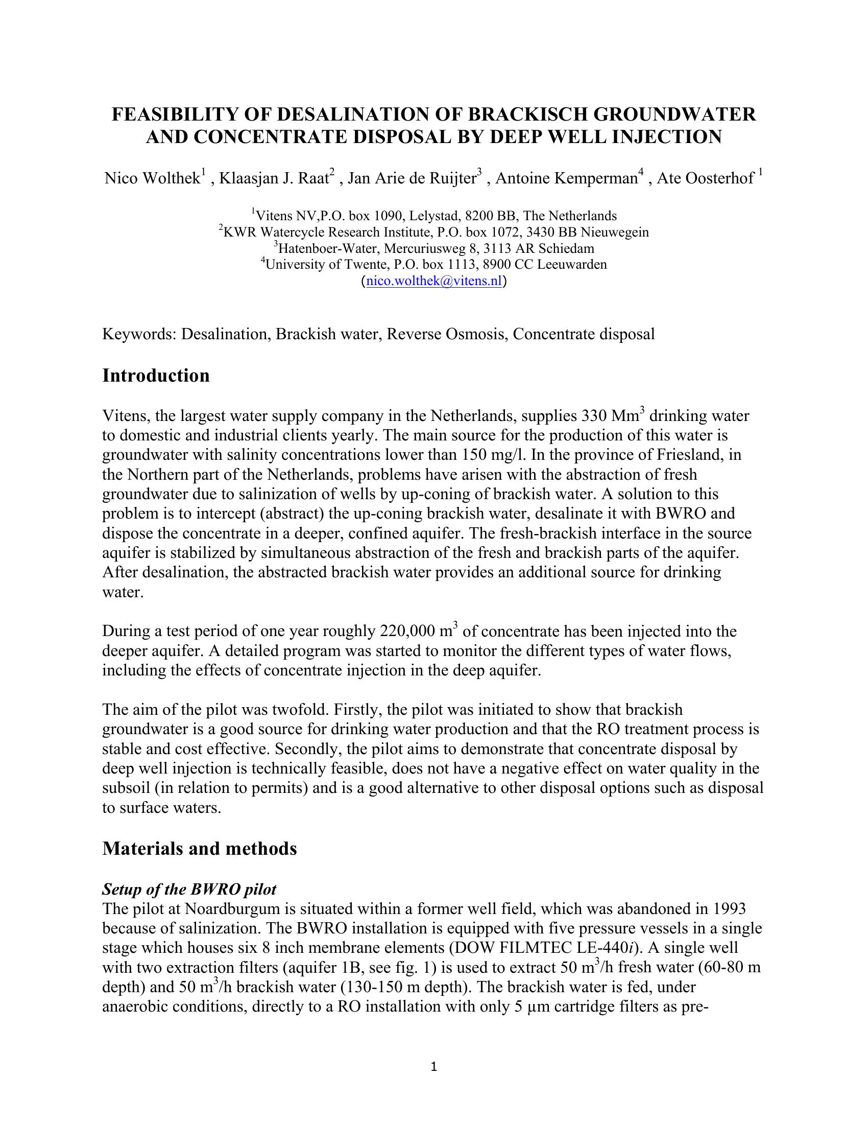 Feasibility of desalination of brackisch groundwater and concentrate disposal by deep well injection