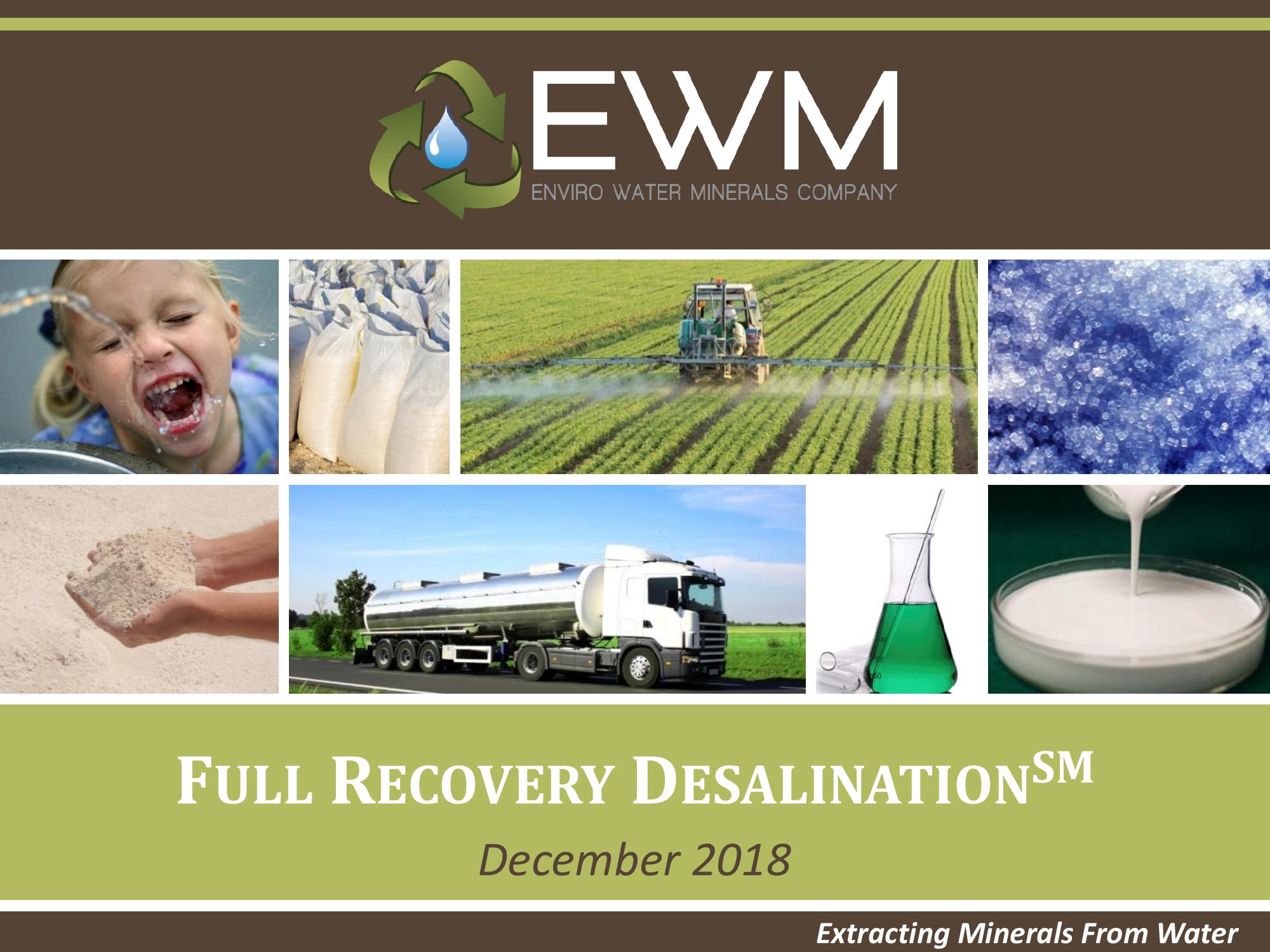 Enviro Water Minerals Company?s (EWM) Full Recovery DesalinationSM is a revolutionary and environmentally friendly approach to fresh water production. Full Recovery DesalinationSM extracts the dissolved solids contained in a variety of water sources for beneficial use, leaving potable water for municipal and other uses. Utilizing proven, commercially available technologies in unique and innovative configurations, EWM chemically separates the contaminants into high-purity, industrial-grade mineral products for use in commercial markets.
