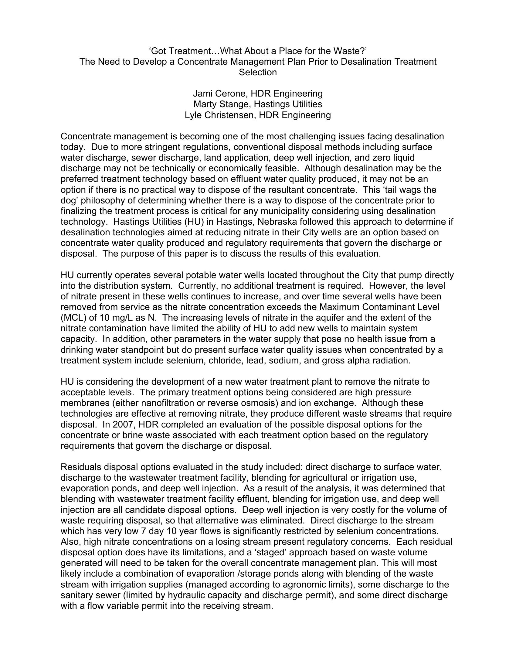 Got Treatment? What About a Place for the Waste?’ The Need to Develop a Concentrate Management Plant Prior to Desalination Treatment Selection
