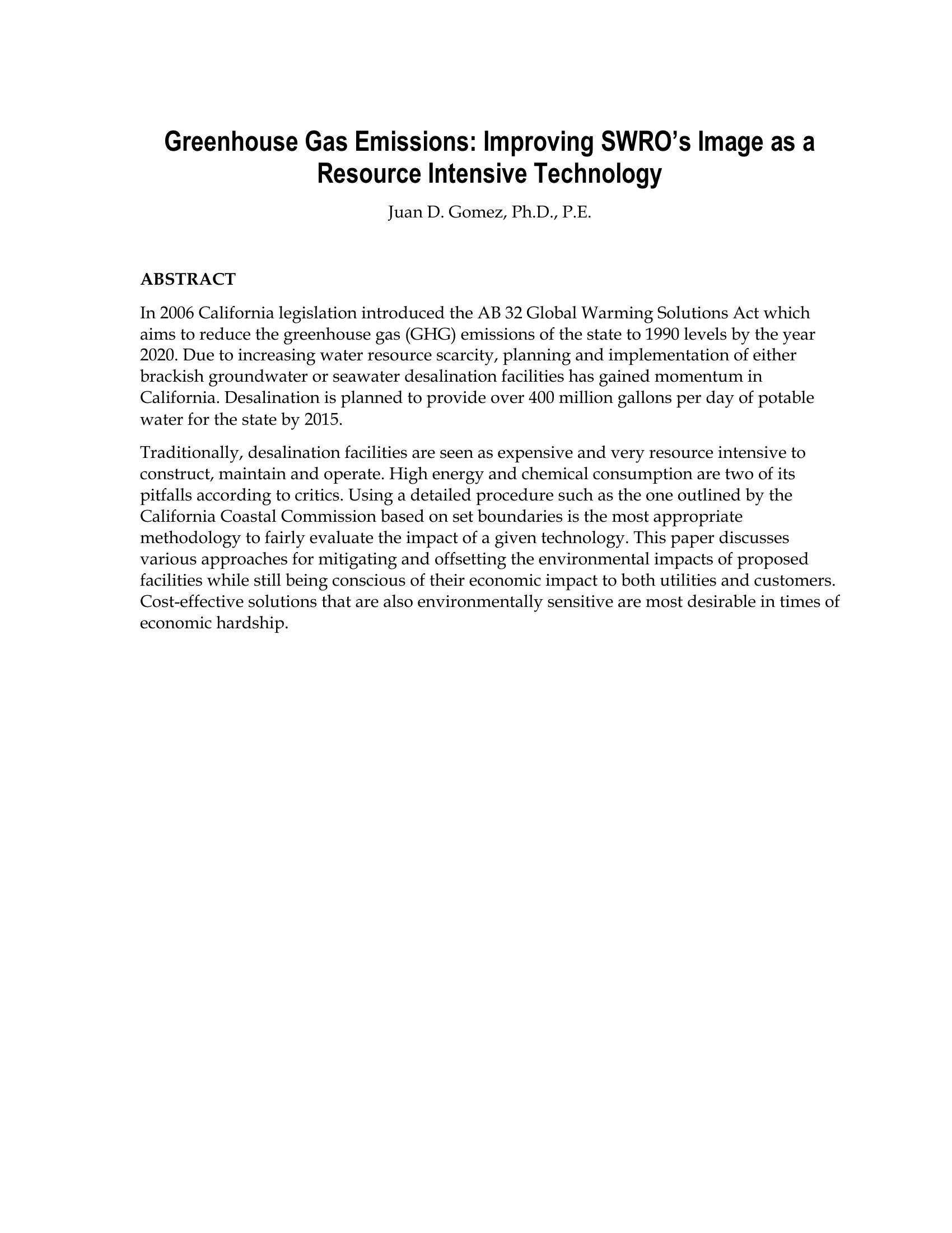 Greenhouse Gas Emission: Improving SWRO’s Image as a Resource Intensive Technology
