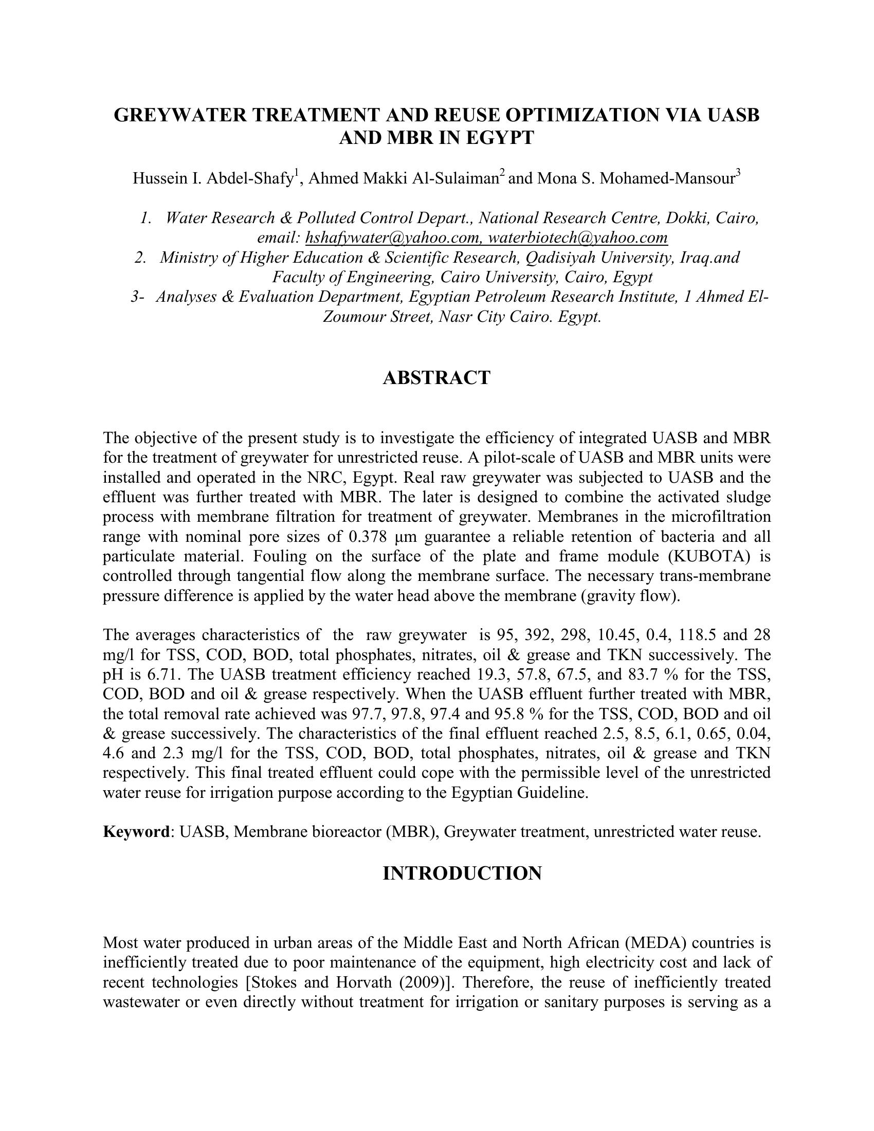 Greywater Treatment and Reuse Optimization via UASB and MBR in Egypt