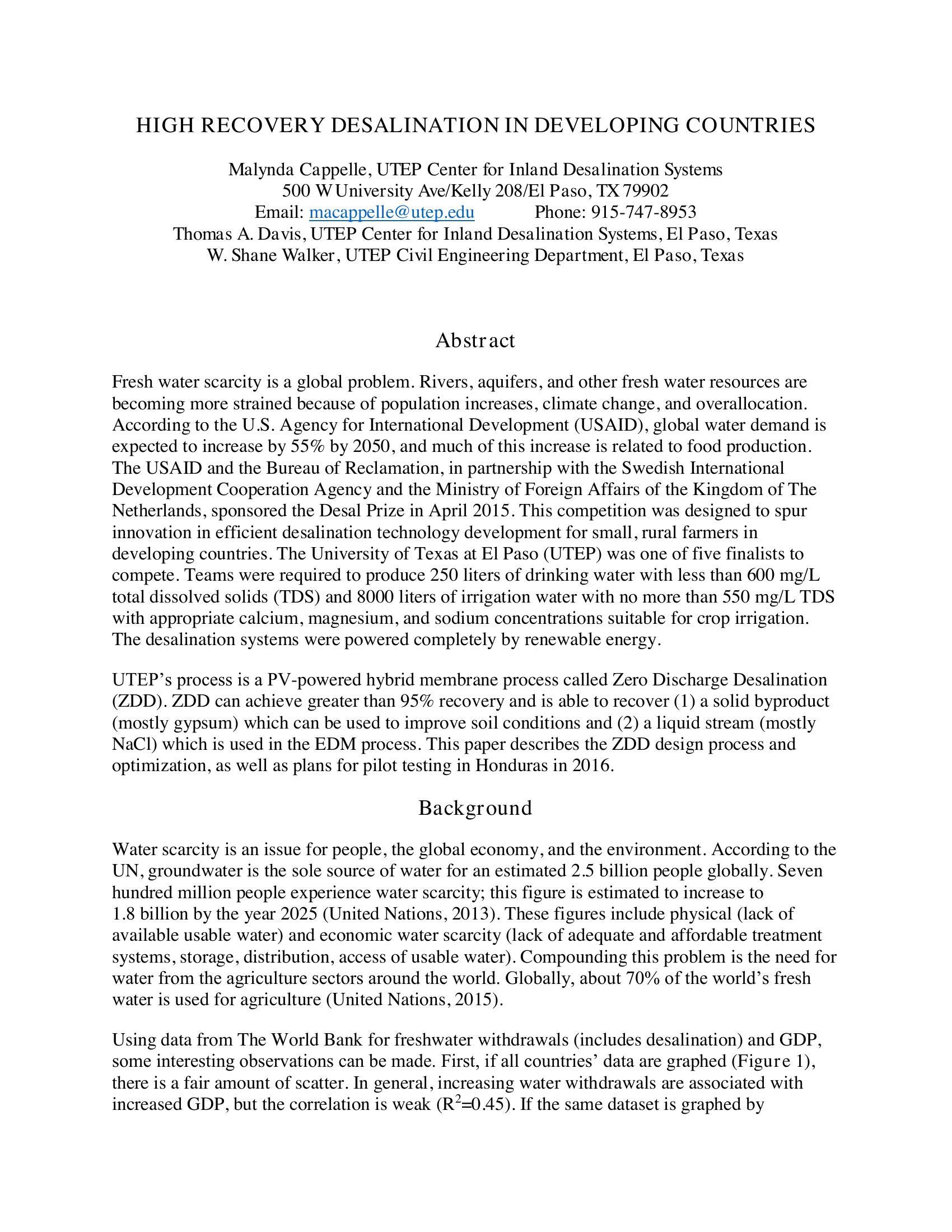 This paper describes the Zero Discharge Desalination design process and optimization done at the University of Texas at El Paso, as well as plans for pilot testing in Honduras in 2016. The target was to produce 250 liters of drinking water with less than 600 mg/L total dissolved solids (TDS) and 8000 liters of irrigation water with no more than 550 mg/L TDS with appropriate calcium, magnesium, and sodium concentrations suitable for crop irrigation. The desalination systems were powered completely by renewable energy. UTEP?s process is a PV-powered hybrid membrane process called Zero Discharge Desalination (ZDD). ZDD can achieve greater than 95% recovery and is able to recover (1) a solid byproduct (mostly gypsum) which can be used to improve soil conditions and (2) a liquid stream (mostly NaCl) which is used in the EDM process.