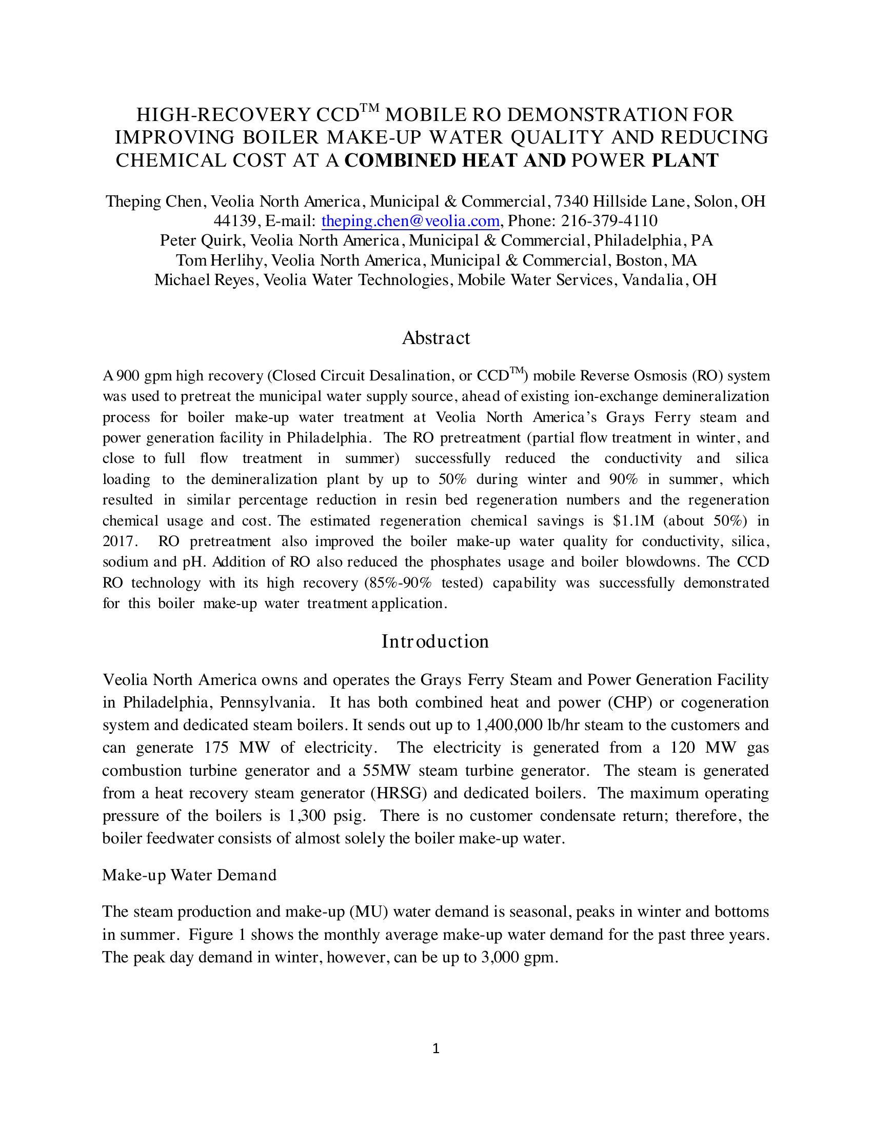 High-Recovery Mobile CCD? RO for Improving Boiler Make-up Water Quality and Reducing Chemical Cost at a Combined Heat & Power Plant
