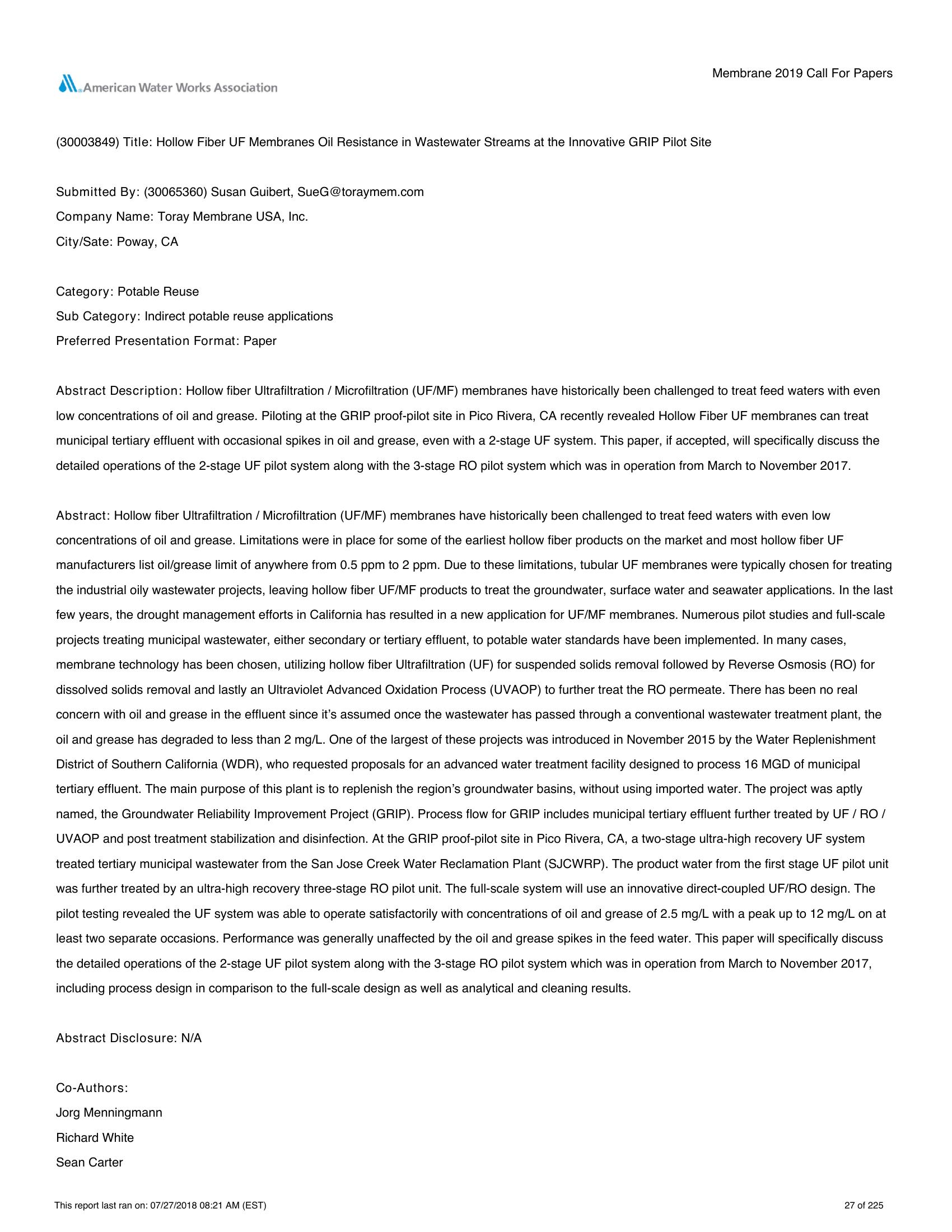 | Keywords | Hollow Fiber Ultrafiltration, Oil and Grease Resistance, GRIP Pilot Site |