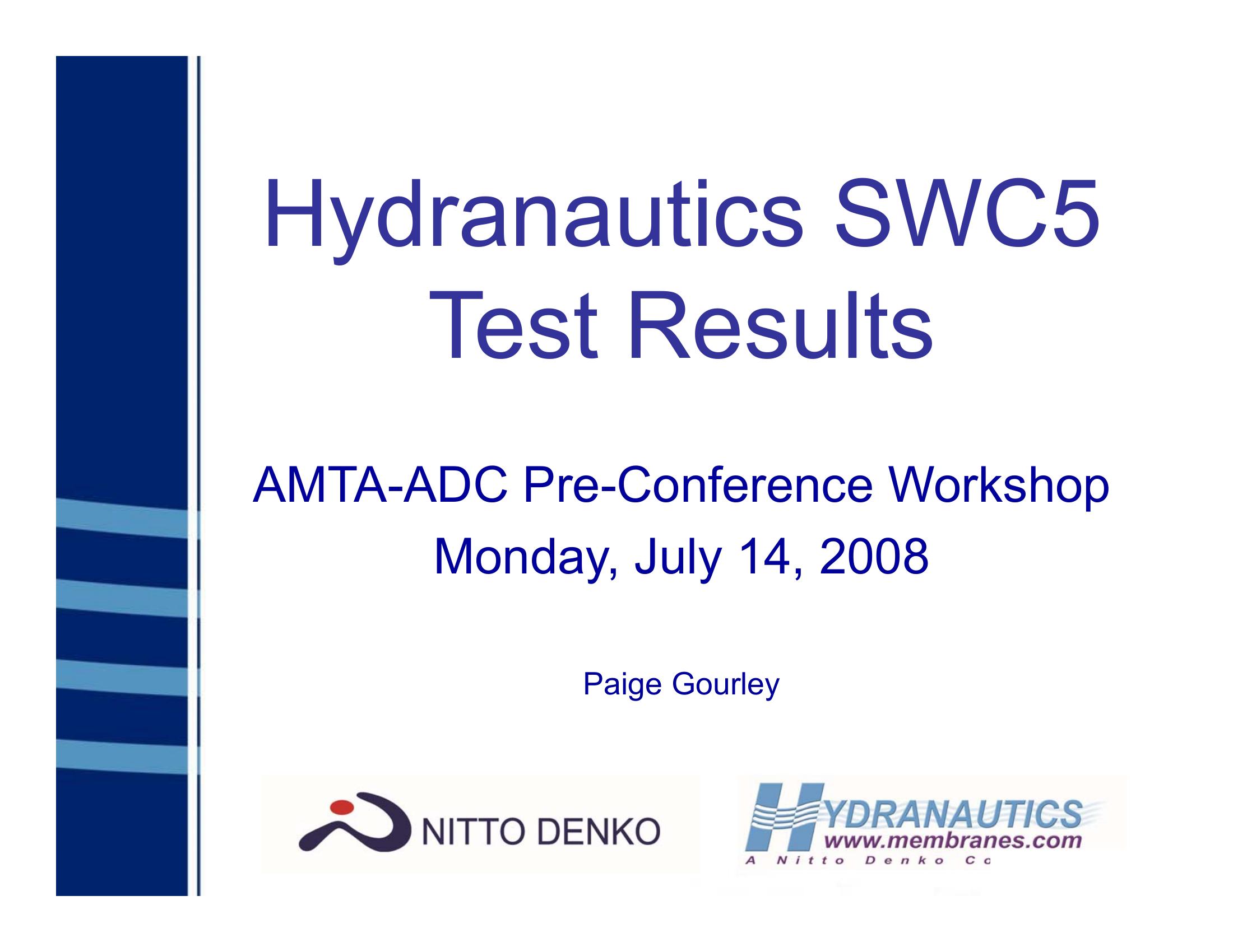 The mission of the Affordable Desalination Collaboration (ADC) is to promote seawater desalination using reverse osmosis (SWRO) as an affordable, viable source of fresh water. In order to accomplish this mission the ADC conducted a multiphase pilot taking feed water from the Pacific Ocean (Navy intake at Port Hueneme, CA). This paper contains pilot results using the SWC5 membrane elements from HydranauticsTM.