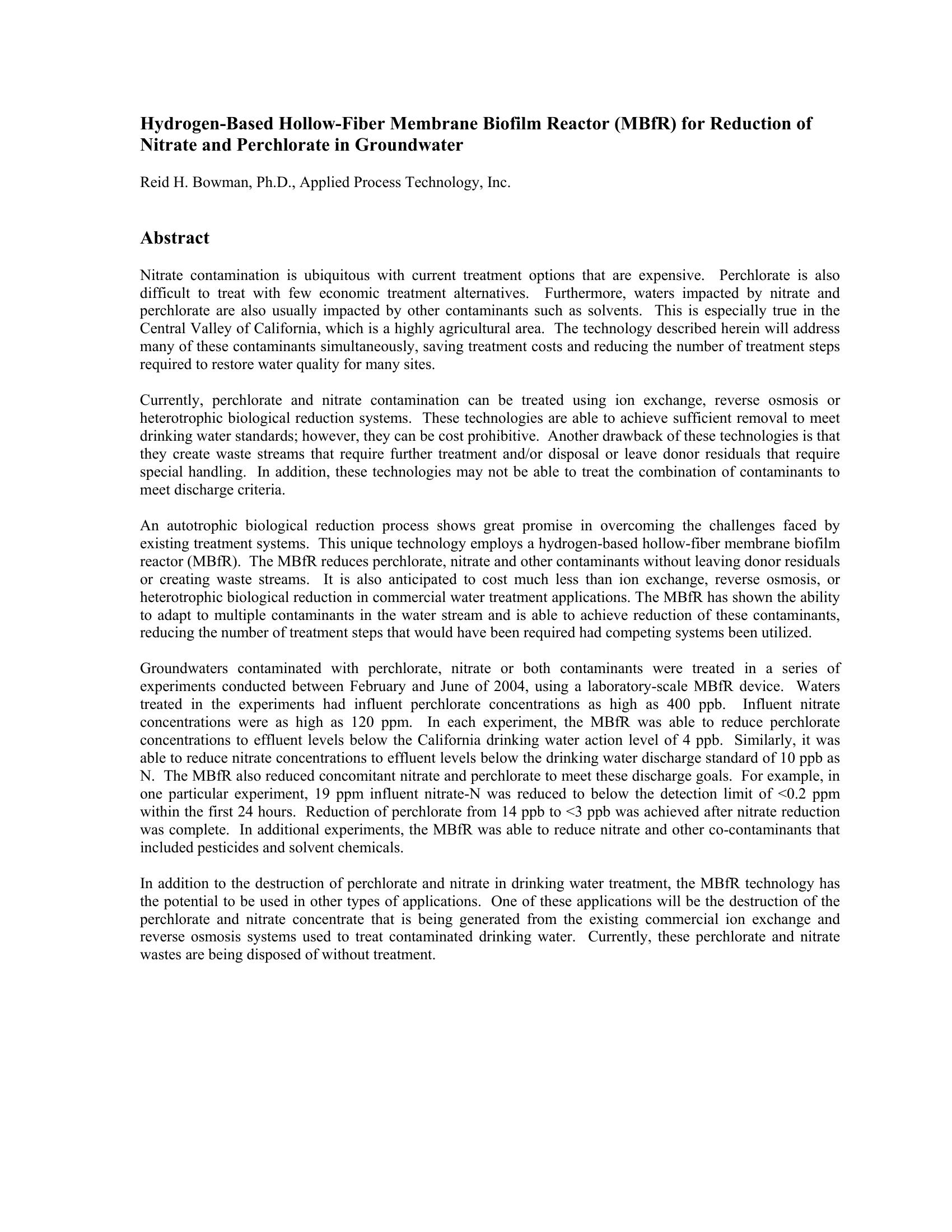 Ammonium perchlorate, a chemical used primarily as a rocket fuel or propellant, has been detected in a growing number of ground water sources in California and at least 14 other states. Perchlorate has adverse health impacts even at very low concentrations (1 ppb to 4 ppb).Three treatment technologies are considered effective treatment. Ion exchange (IX) and reverse osmosis (RO) concentrate perchlorate into a waste stream. Biological reduction reduces the perchlorate to chloride without the production of residuals requiring special handling. The paper presents results from a unique hollow-fiber membrane biofilm reactor (MBfR).