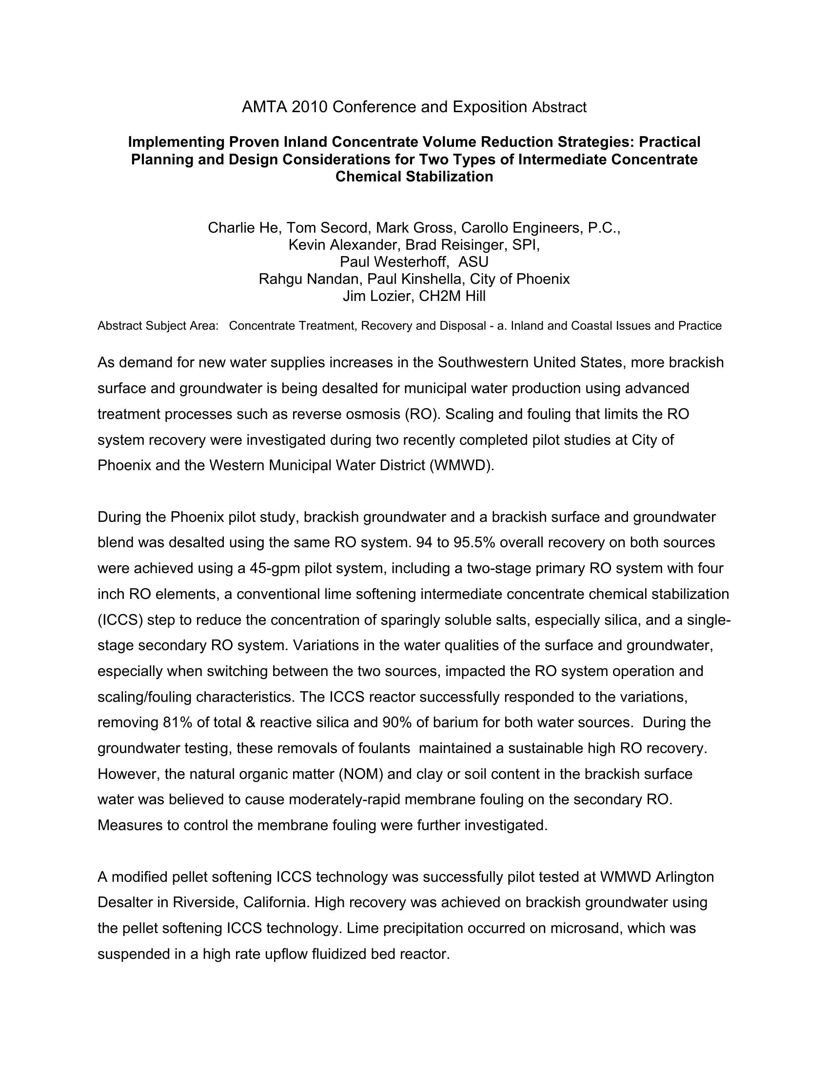 Implementing a Proven Inland Concentrate Volume Reduction Technology: Practical Planning and Design Considerations for Intermediate Concentrate Chemical Stabilization