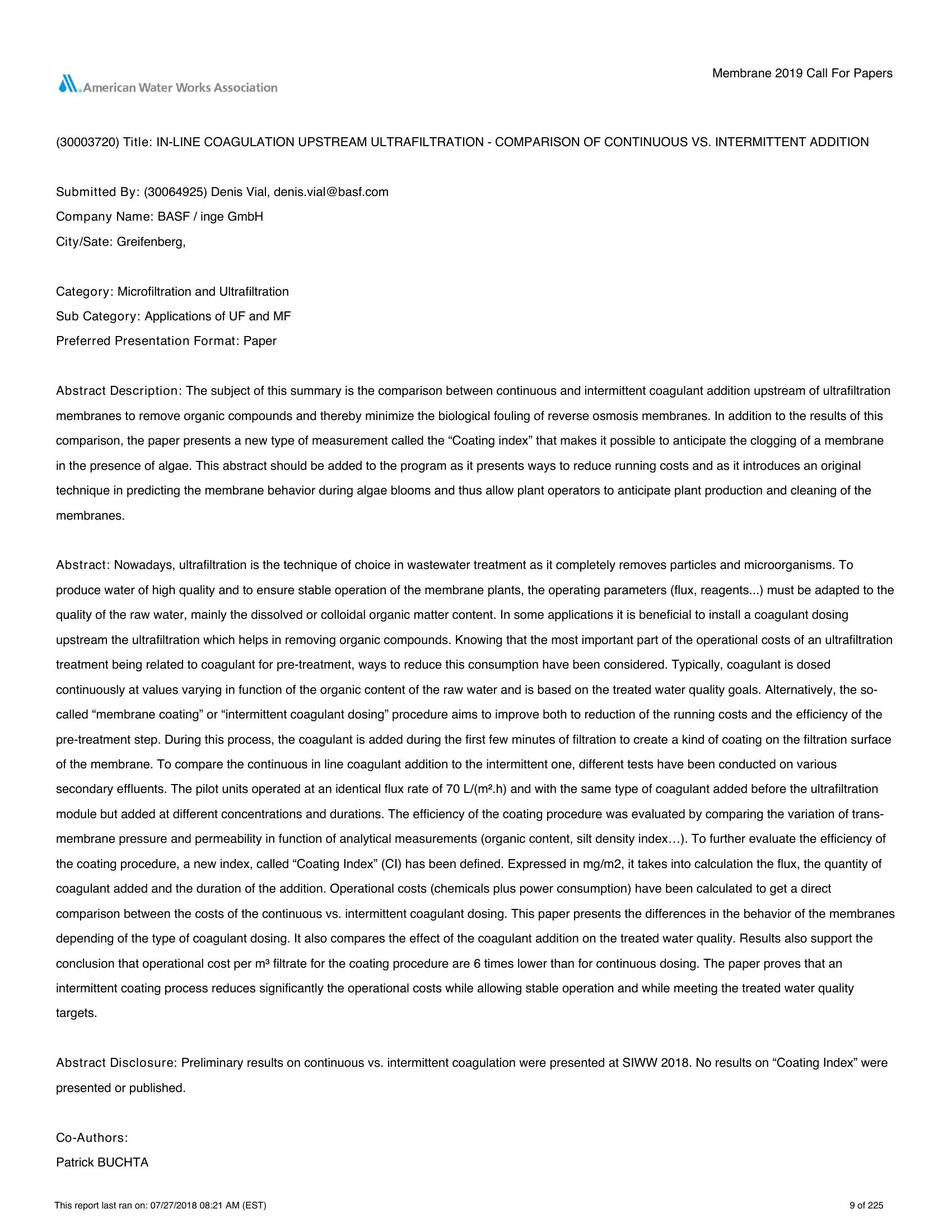 | Keywords | Coagulation, Coating, Ultrafiltration |