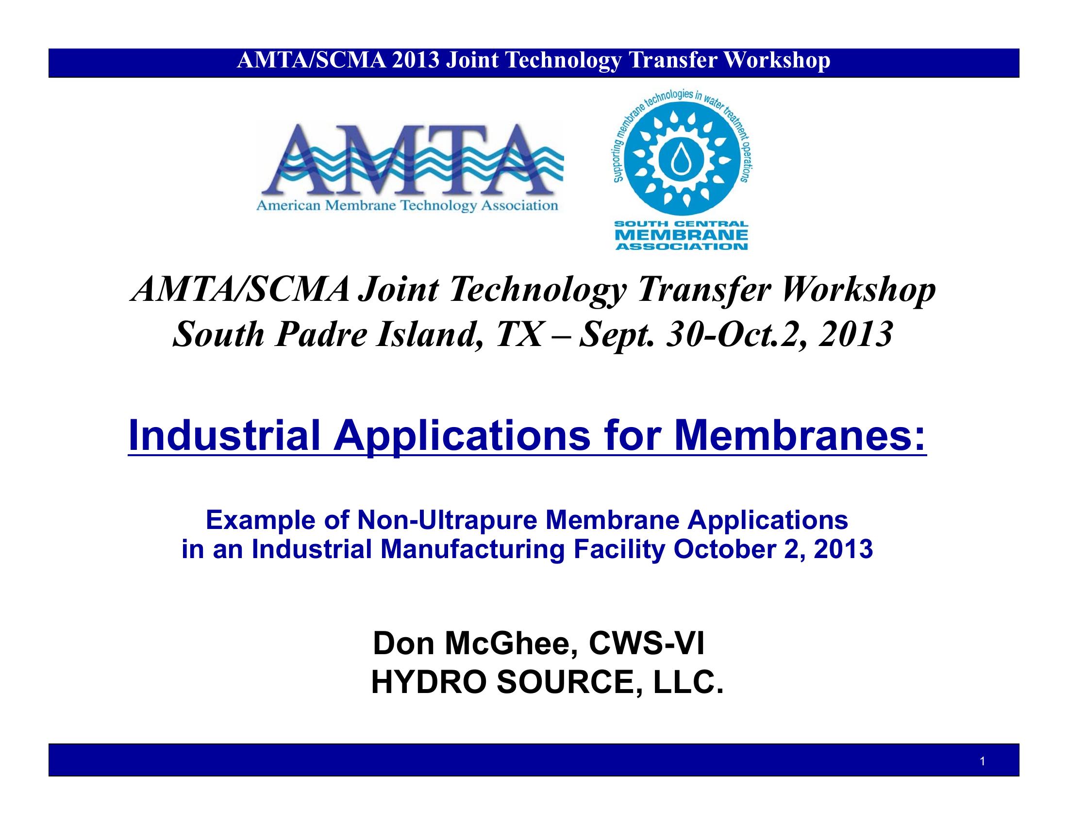 This PowerPoint examines several Non-Ultrapure Membrane applications in Industrial Manufacturing facilities and the strategy of a plant expansion using membranes.