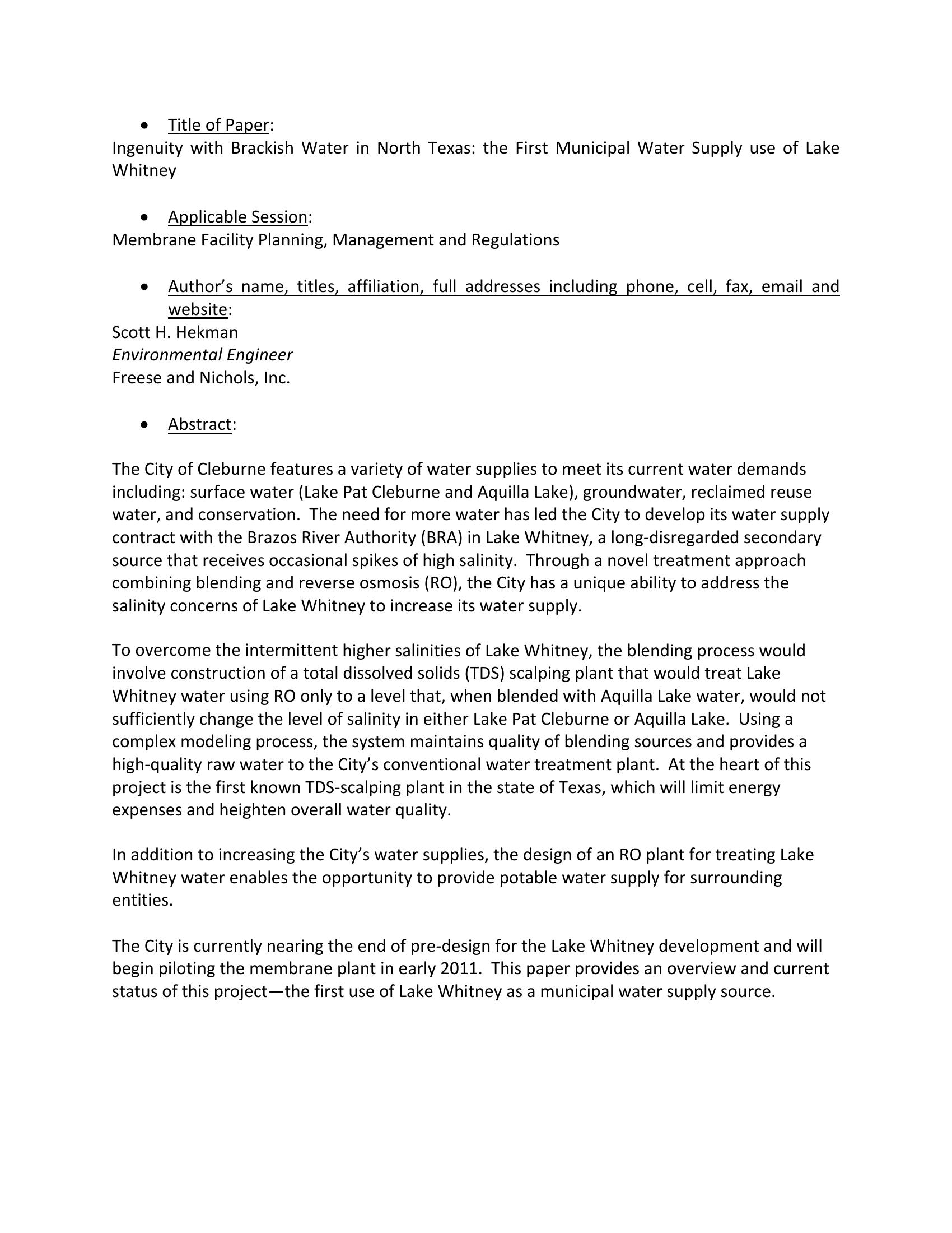 This paper provides an overview and current status of the City of Cleburne Reverse osmosis membfrane plant project?the first use of Lake Whitney as a municipal water supply source.