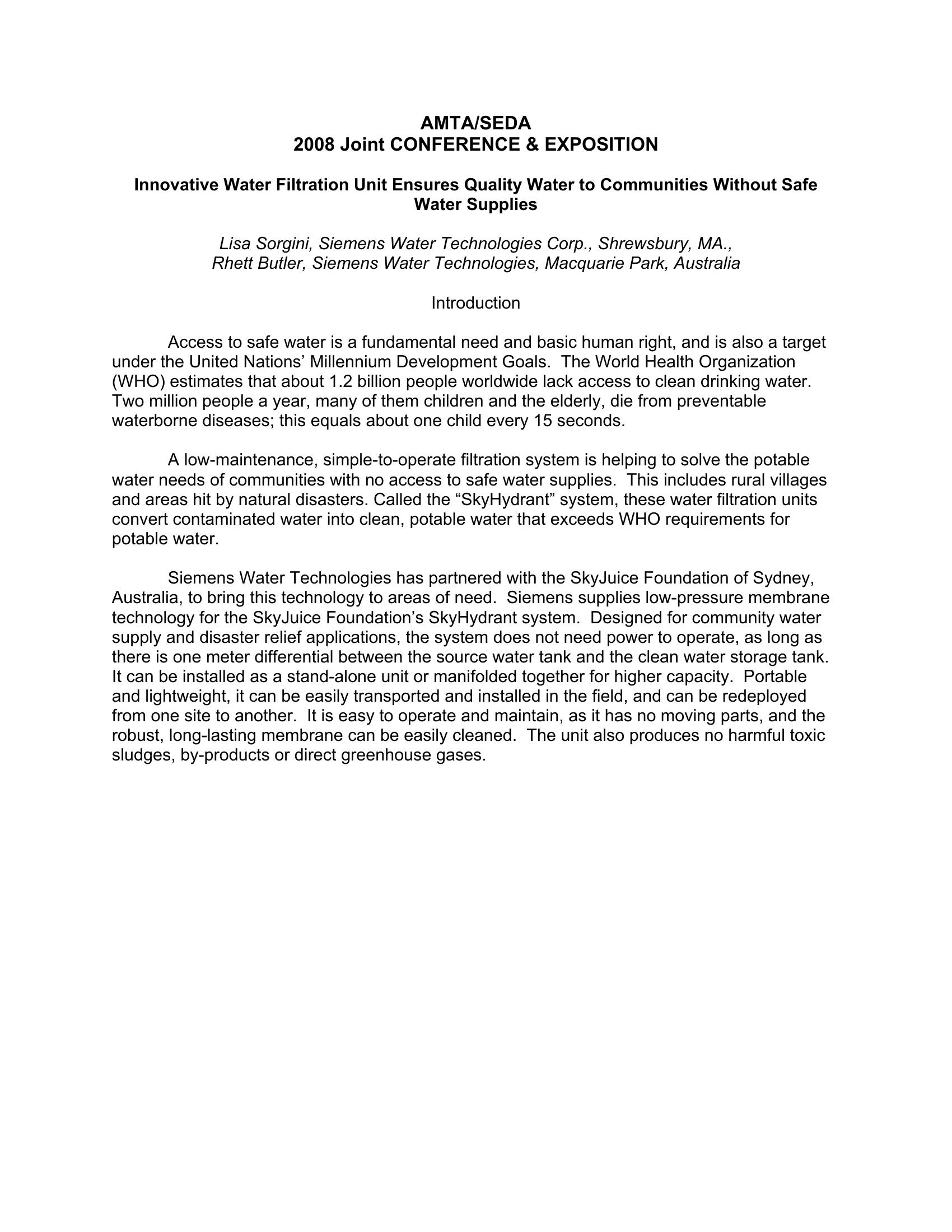 This paper discussed the ?SkyHydrant? system that uses water filtration units to convert contaminated water into clean, potable water that exceeds WHO requirements for potable water. Siemens Water Technologies has partnered with the SkyJuice Foundation of Sydney, Australia to provide these units. The design and operation are discussed.