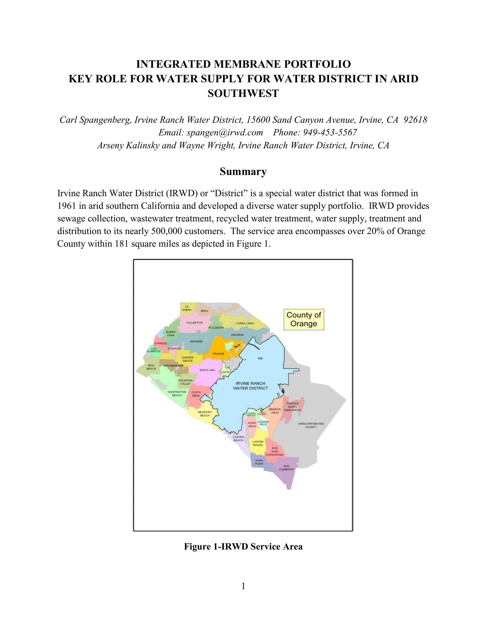 The IRWD was a typical water agency in southern California, utilizing imported surface water supplies for potable water usage. As demands for water increased the District evaluated multiple, local water sources, resulting in the development, construction, and operation of five membrane technologies: DATS NF, CATS NF Plant, DP-PTP RO Plant, Desalter RO Plant, MF Plant, and an MBR UF Plant. The District now has a diverse and complex water portfolio that has the potential to provide up to 40% of IRWD’s ultimate water supply.