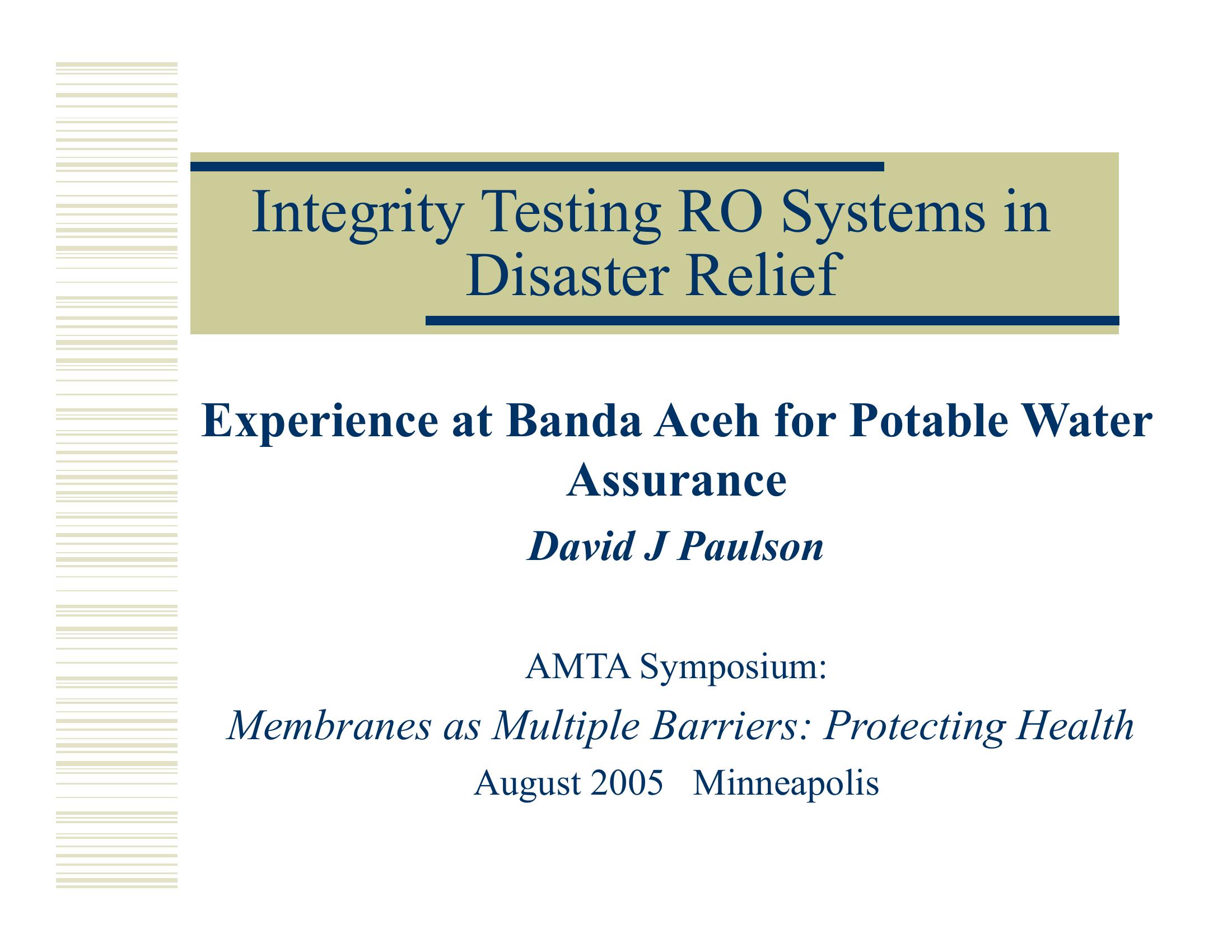 This presentation discusses the relief efforts for Banda Aceh to repair their potable water supply. Covered are the shipment of a reverse osmosis system and the regulations for quality testing. The presentation then covers a membrane system integrity method using water soluble dye