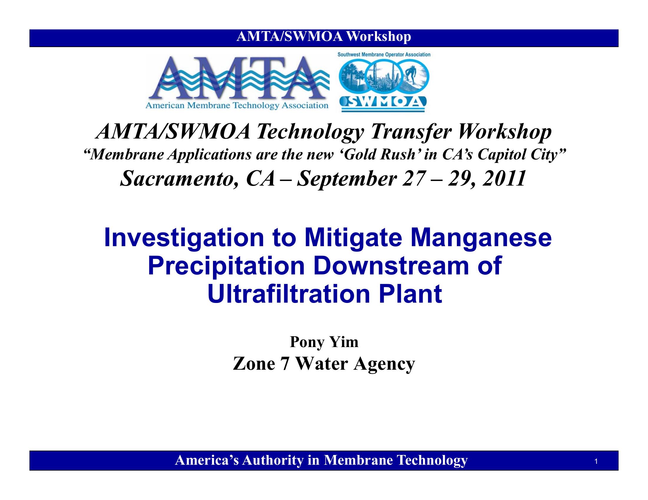 This presentation covers investigation of manganese precipitation downstream of an ultrafiltration plant. Different oxidants and dosages for Mn precipitation were evaluated. It was concluded that ultrafiltration membrane does not retain Mn2+ but and it must be oxidized to MnO2 and precipitate before the ultrafiltration process.