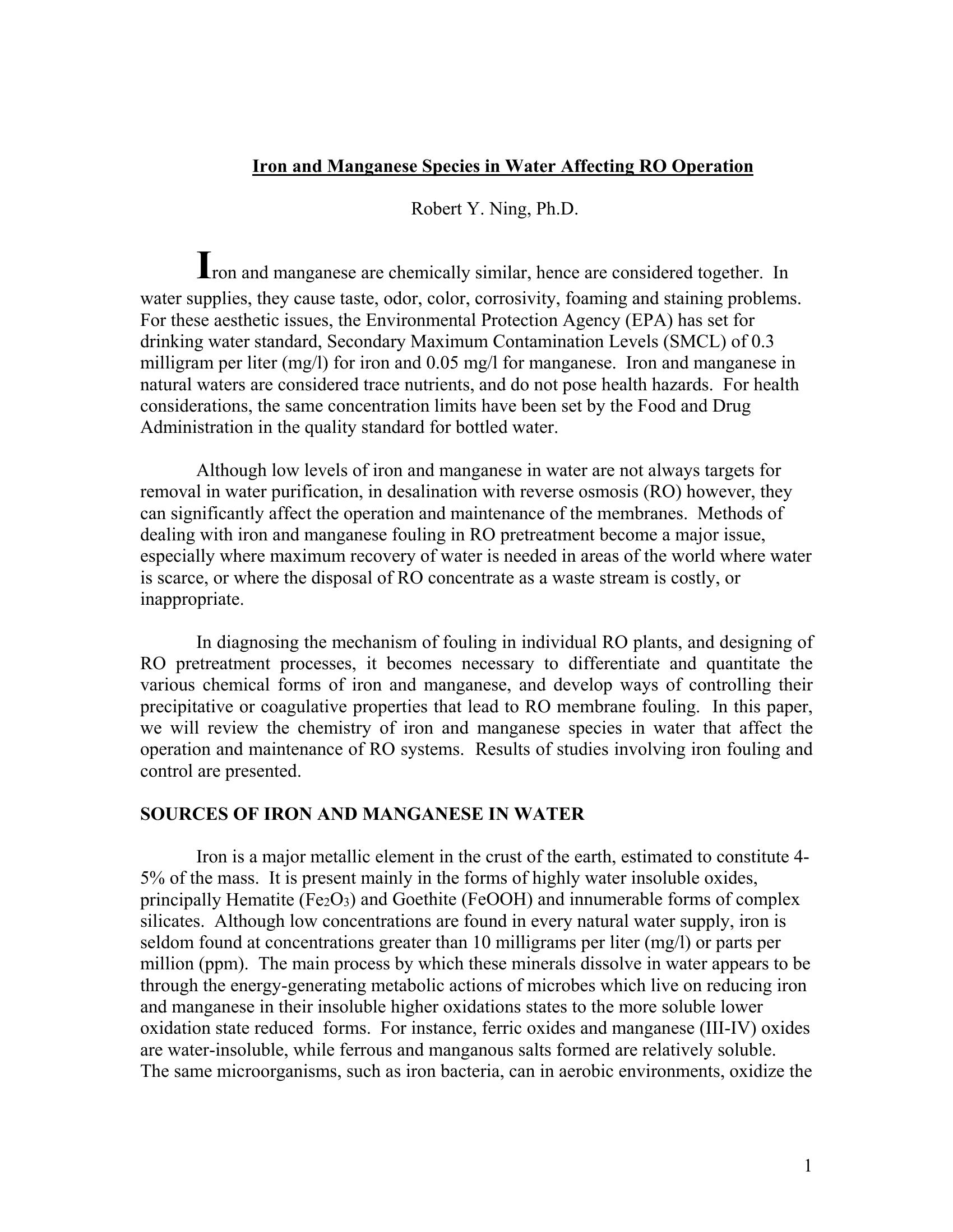 This paper reviews the chemistry of iron and manganese species in water that affect the operation and maintenance of Reverse Osmosis systems. Results of studies involving iron fouling and control are presented.