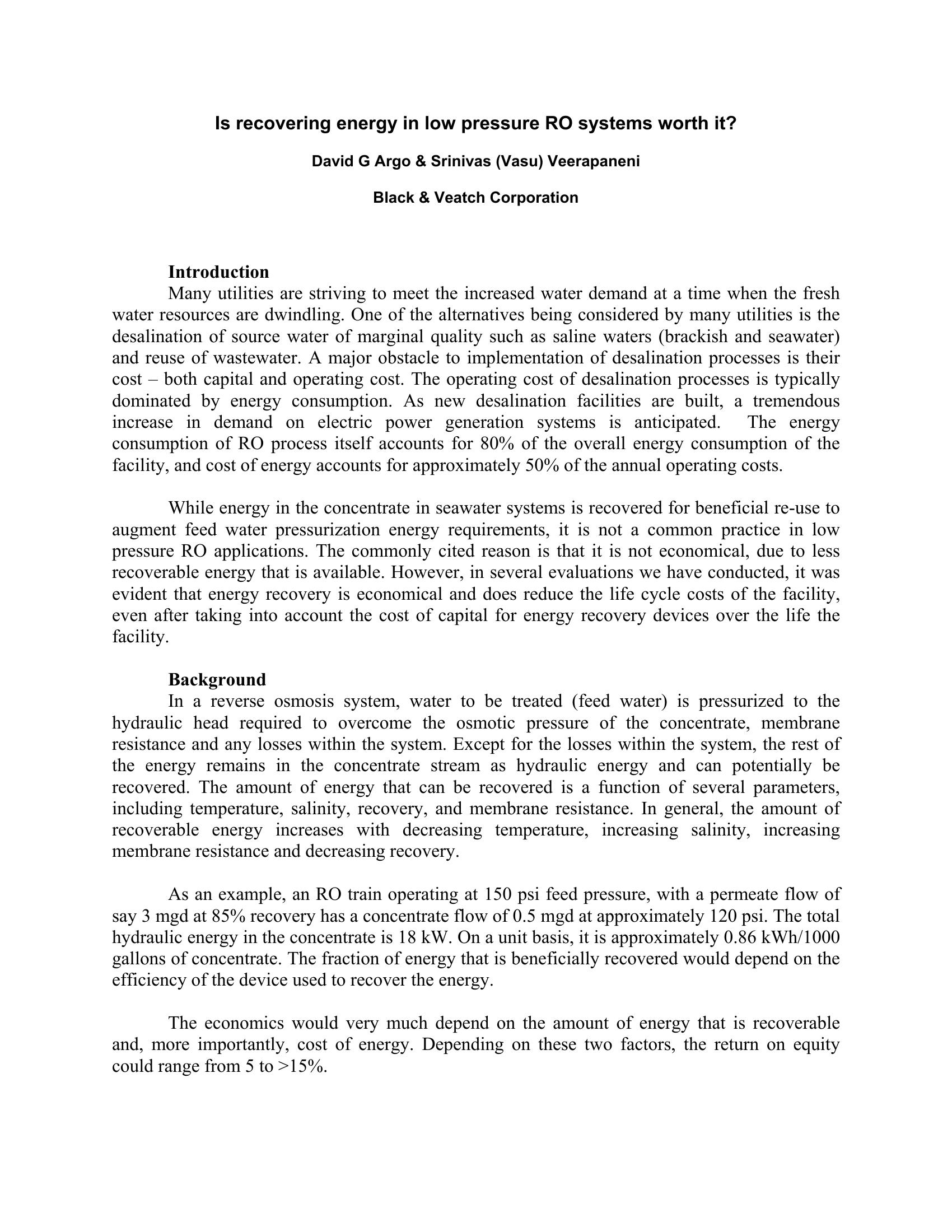 Is recovering energy in low pressure RO systems worth it? The energy consumption of RO process itself accounts for 80% of the overall energy consumption of the facility, and cost of energy accounts for approximately 50% of the annual operating costs. The economics would very much depend on the amount of energy that is recoverable and, more importantly, cost of energy. Depending on these two factors, the return on equity could range from 5 to >15%. This paper discusses case studies on this subject.