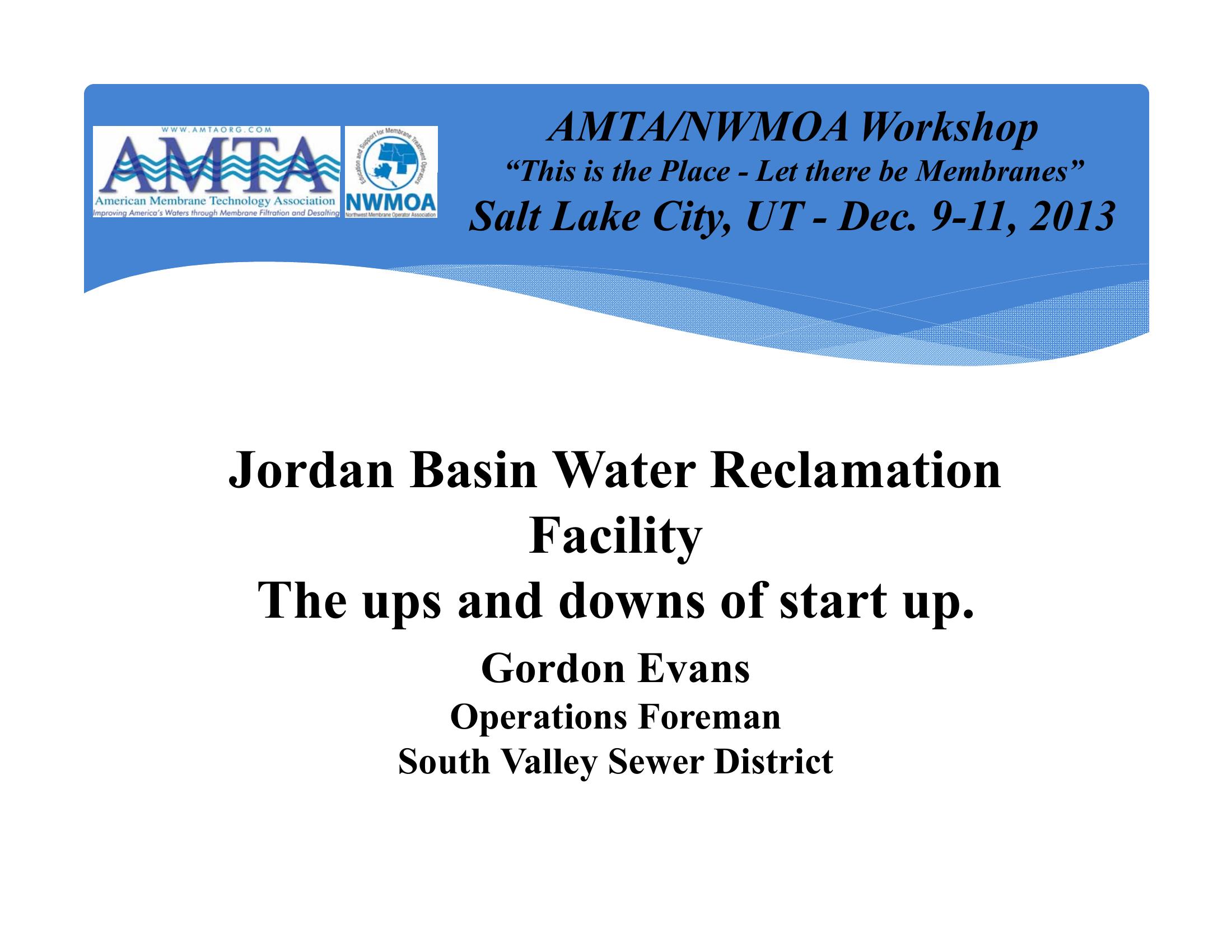 This presentation shows a visual depiction of the Jordan Basin Water Reclamation Facility located in Riverton, Utah. The treatment process includes a membrane bioreactor (MBR) system and an odor control system. Several facility startup issues are also highlighted.