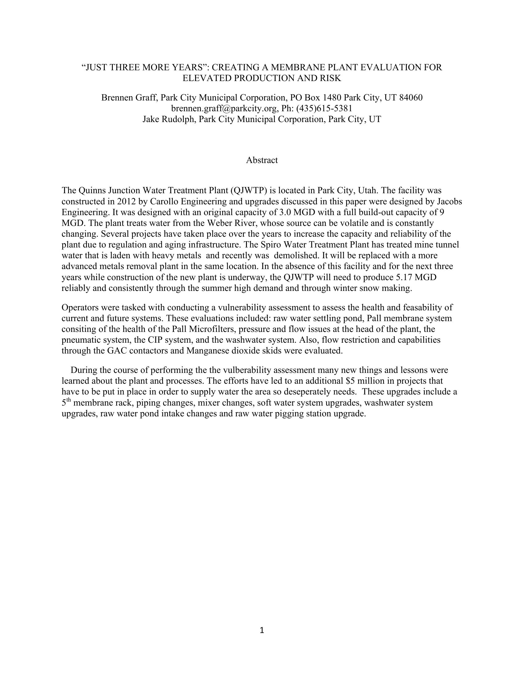The Quinns Junction Water Treatment Plant (QJWTP) is located in Park City, Utah. The facility was constructed in 2012 by Carollo Engineering and upgrades discussed in this paper were designed by Jacobs Engineering. It was designed with an original capacity of 3.0 MGD with a full build-out capacity of 9 MGD. The plant treats water from the Weber River, whose source can be volatile and is constantly changing. Several projects have taken place over the years to increase the capacity and reliability of the plant due to regulation and aging infrastructure. The Spiro Water Treatment Plant has treated mine tunnel water that is laden with heavy metals and recently was demolished. It will be replaced with a more advanced metals removal plant in the same location. In the absence of this facility and for the next three years while construction of the new plant is underway, the QJWTP will need to produce 5.17 MGD reliably and consistently through the summer high demand and through winter snow making. Operators were tasked with conducting a vulnerability assessment to assess the health and feasability of current and future systems. These evaluations included: raw water settling pond, Pall membrane system consiting of the health of the Pall Microfilters, pressure and flow issues at the head of the plant, the pneumatic system, the CIP system, and the washwater system. Also, flow restriction and capabilities through the GAC contactors and Manganese dioxide skids were evaluated. During the course of performing the the vulberability assessment many new things and lessons were learned about the plant and processes. The efforts have led to an additional $5 million in projects that have to be put in place in order to supply water the area so deseperately needs. These upgrades include a 5th membrane rack, piping changes, mixer changes, soft water system upgrades, washwater system upgrades, raw water pond intake changes and raw water pigging station upgrade.
