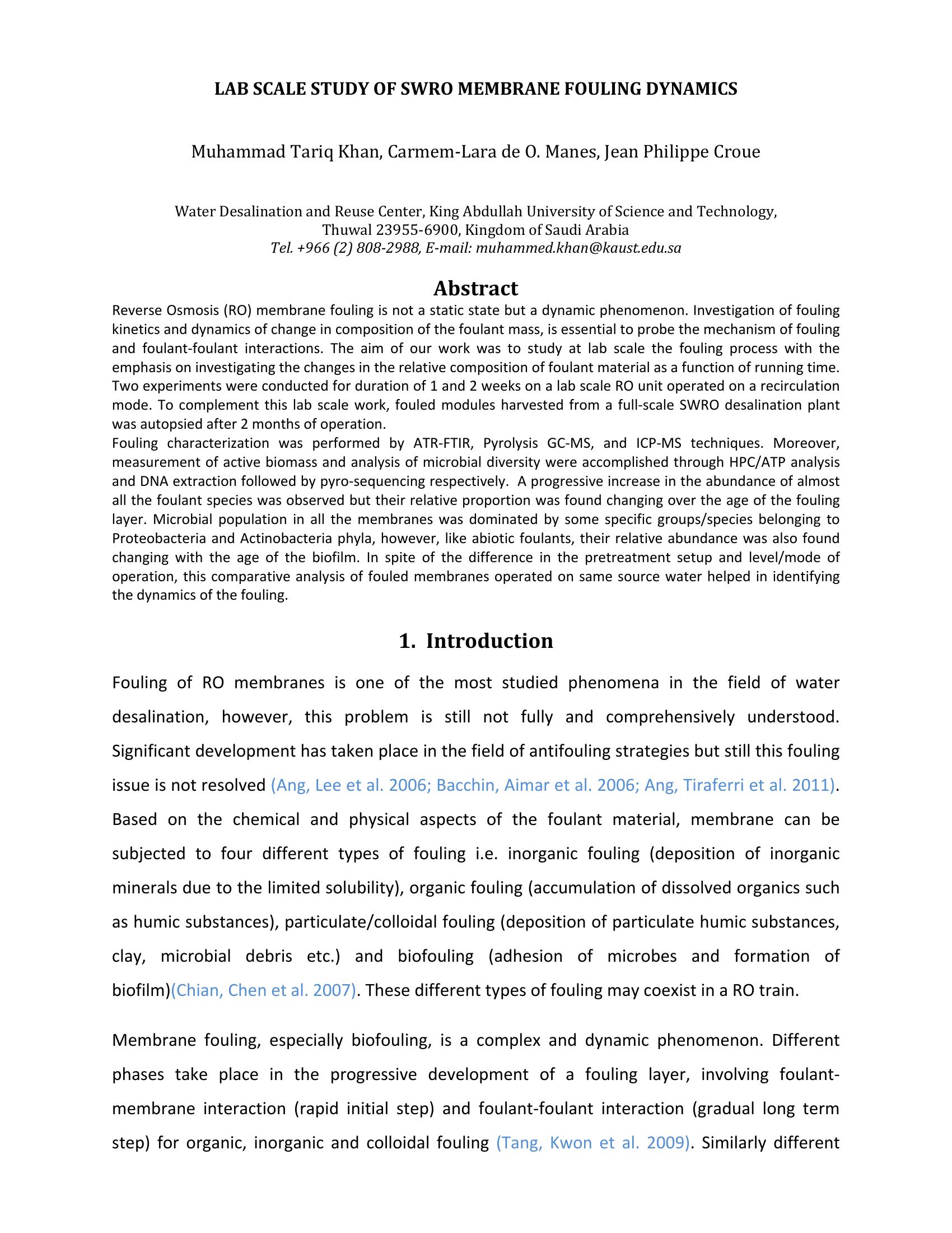 | Keywords | fouling, RO membranes |