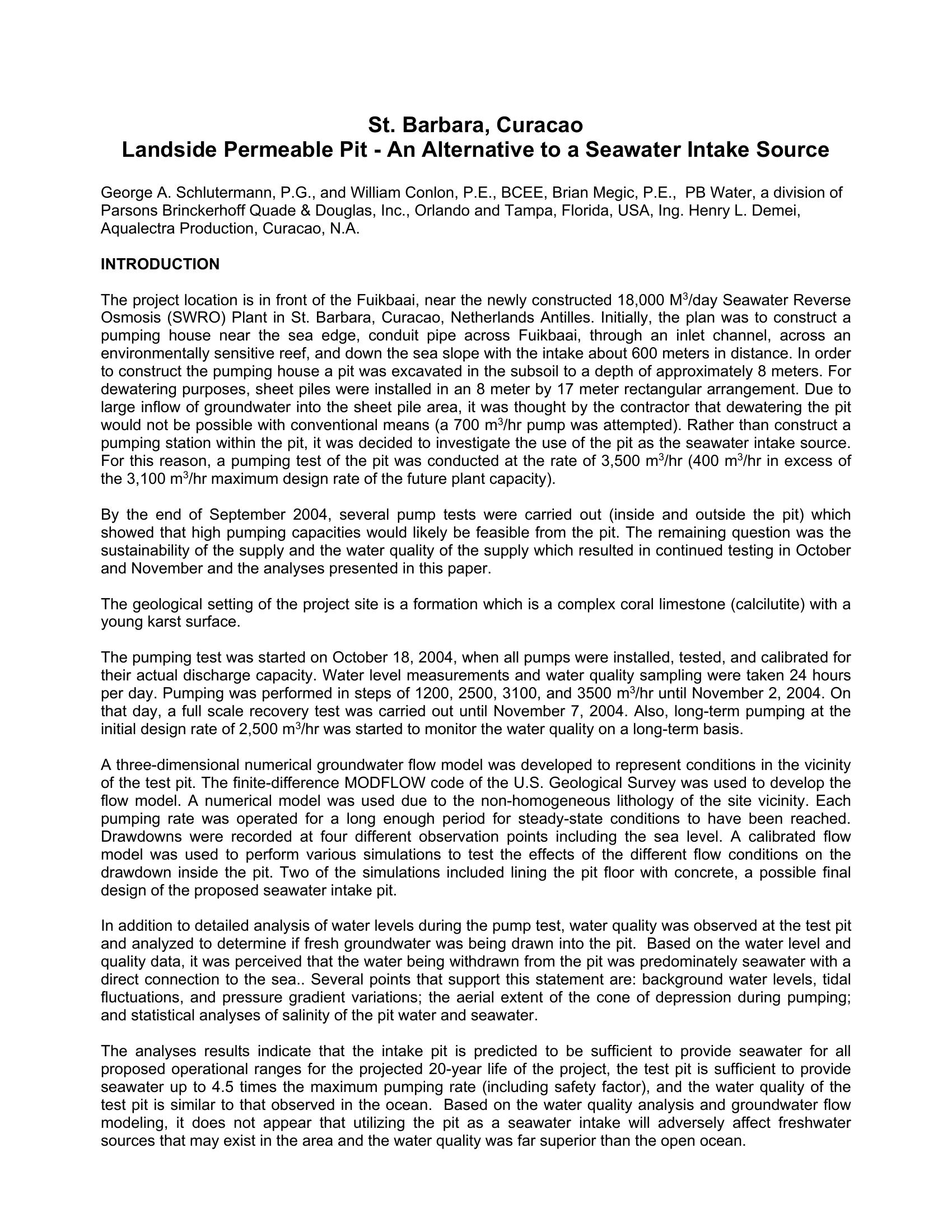 Use of a land side permeable pit as a SW intake source in Curacao