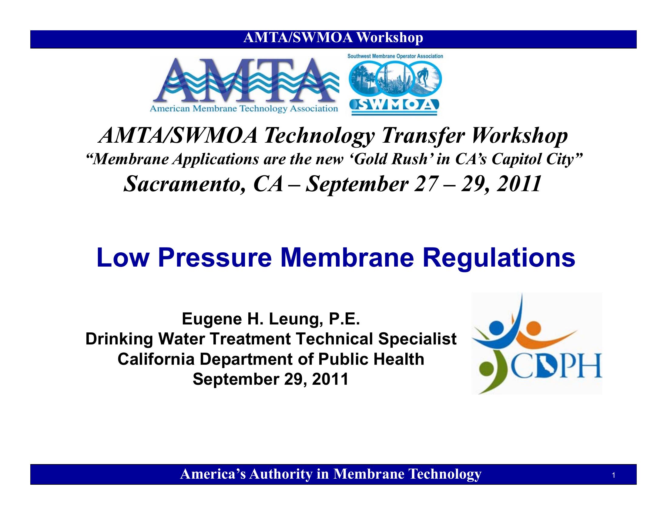 This presentation provides an overview of the regulatory framework related to the use of membranes in the State of California. California’s permitting process for new treatment facilities and the certification requirements are described. There is also reference to performance and integrity testing requirements are described and some of challenges are listed.