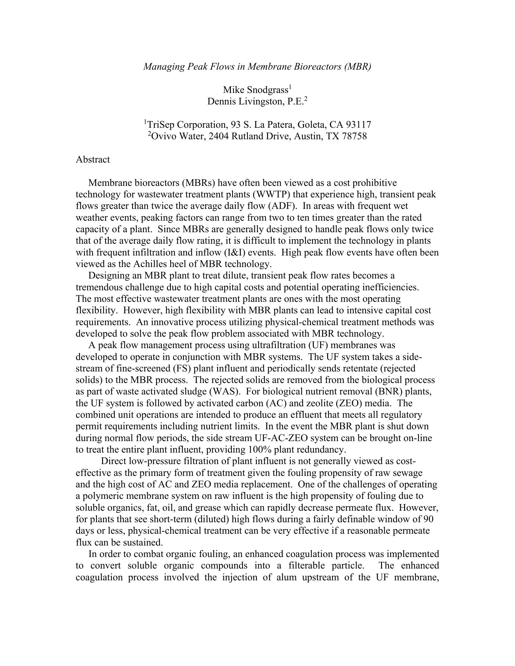 A peak flow management process using ultrafiltration (UF) membranes was developed to operate in conjunction with MBR systems.