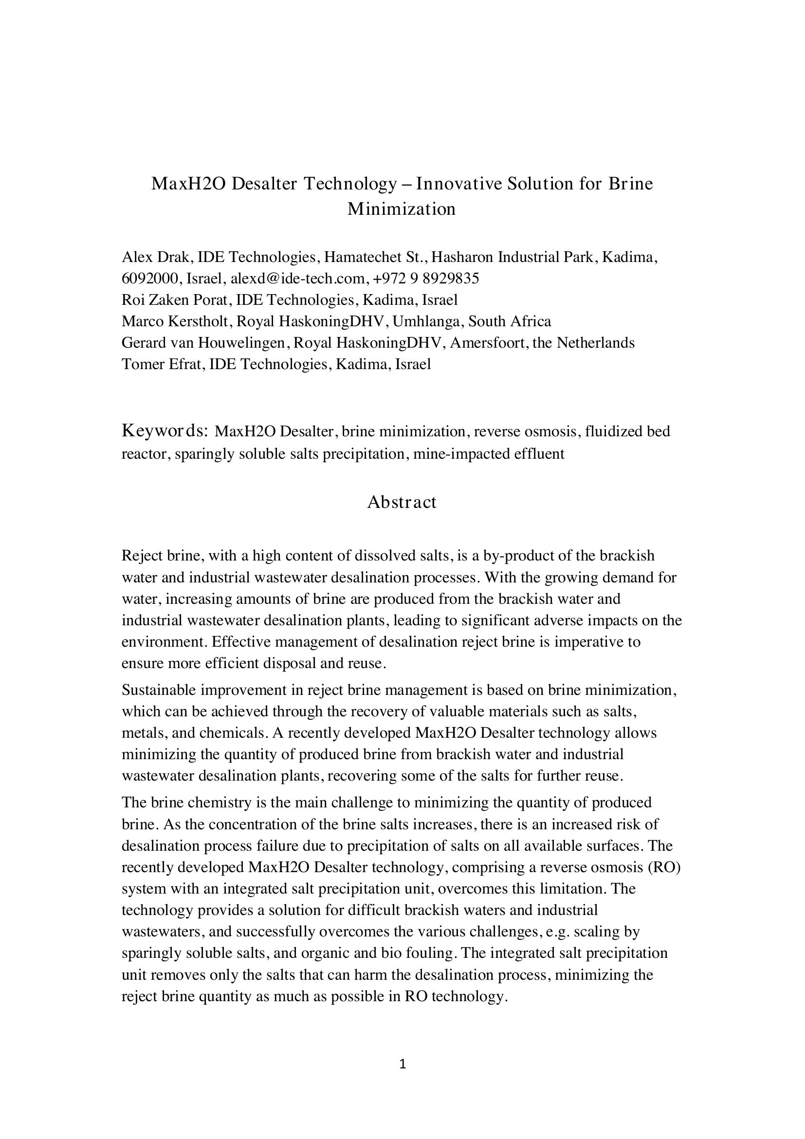 | Keywords | Brine Minimization, MaxH2O Desalter, Reverse Osmosis |
