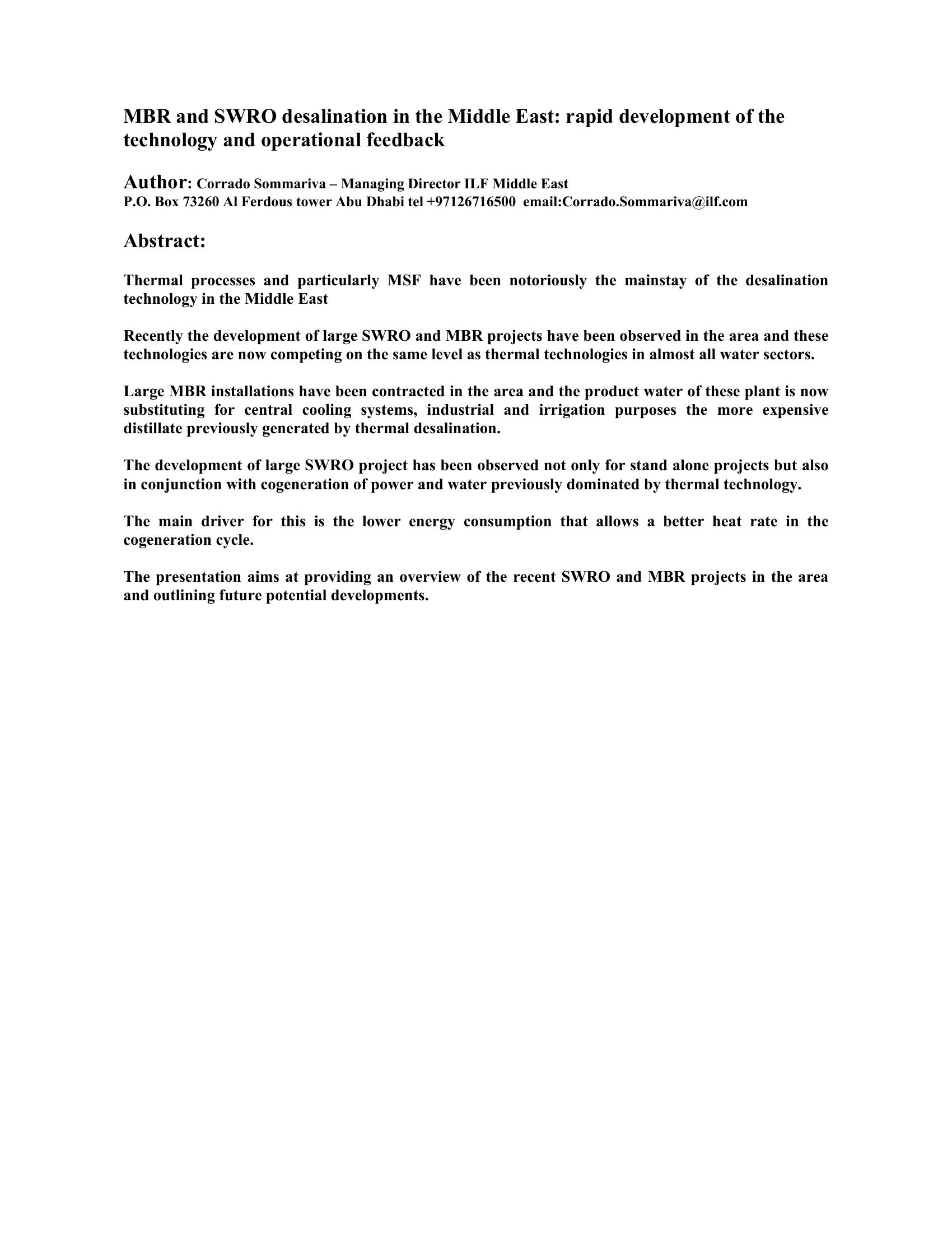 This paper talks about how large SWRO and MBR projects are now competing on the same level as thermal technologies in the Middle East. Large MBR installations have been contracted in the area and the product water of these plant is now substituting for central cooling systems, industrial and irrigation purposes the more expensive distillate previously generated by thermal desalination. The development of large SWRO project has been observed not only for stand alone projects but also in conjunction with cogeneration of power and water previously dominated by thermal technology. The main driver for this is the lower energy consumption that allows a better heat rate in the cogeneration cycle.