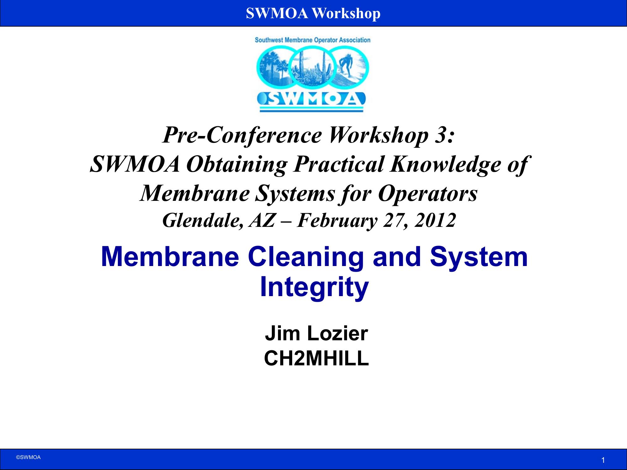 This presentation provides an overview of membrane cleaning and system integrity testing. It describes how both MF/UF and RO membranes require cleaning to restore lost performance. It explains when to clean; what chemicals to use; and key elements of cleaning operations. This paper emphasize that adequate pretreatment and proper operation will go a long way toward minimizing associated maintenance activities.