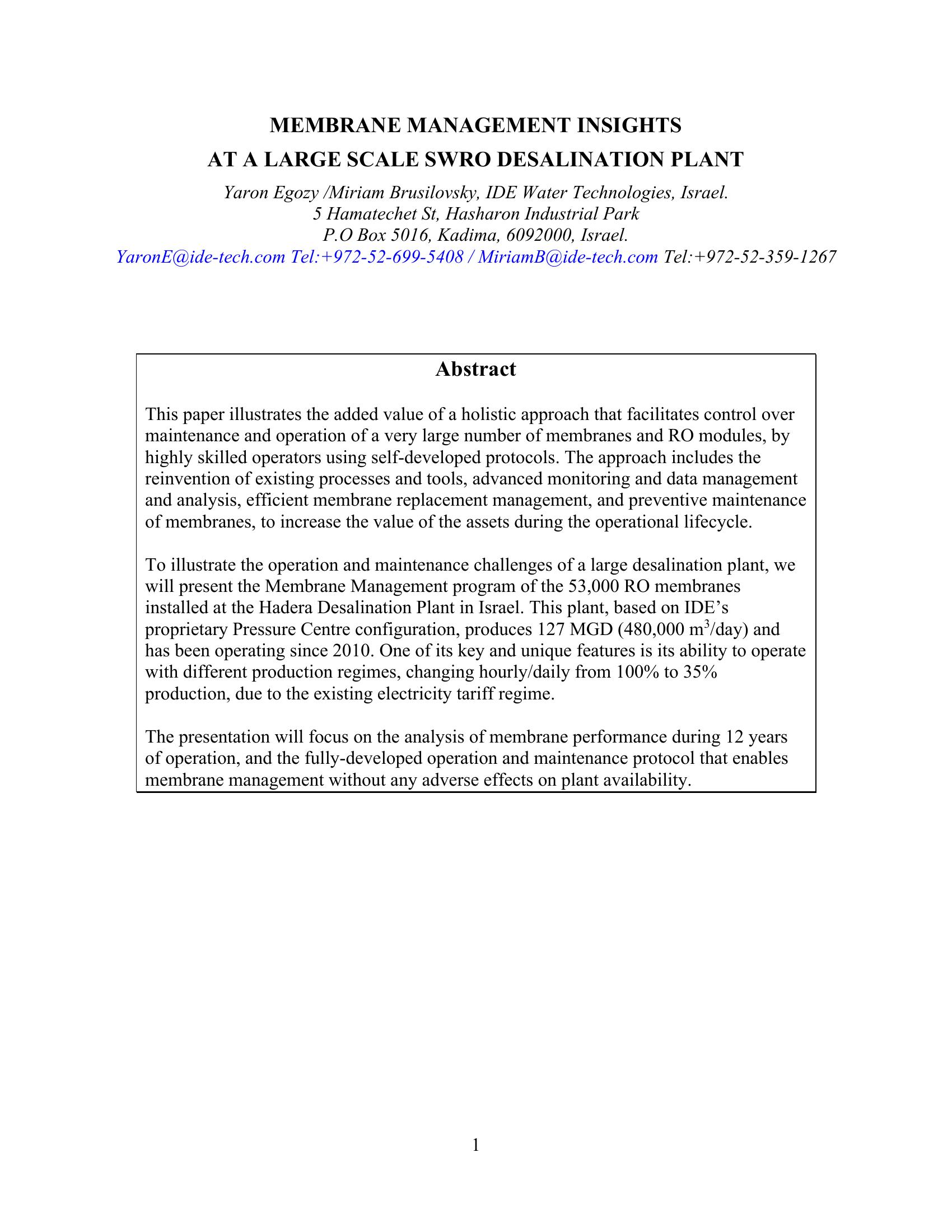 This paper illustrates the added value of a holistic approach that facilitates control over maintenance and operation of a very large number of membranes and RO modules, by highly skilled operators using self-developed protocols. The approach includes the reinvention of existing processes and tools, advanced monitoring and data management and analysis, efficient membrane replacement management, and preventive maintenance of membranes, to increase the value of the assets during the operational lifecycle. To illustrate the operation and maintenance challenges of a large desalination plant, we will present the Membrane Management program of the 53,000 RO membranes installed at the Hadera Desalination Plant in Israel. This plant, based on IDEís proprietary Pressure Centre configuration, produces 127 MGD (480,000 m3/day) and has been operating since 2010. One of its key and unique features is its ability to operate with different production regimes, changing hourly/daily from 100% to 35% production, due to the existing electricity tariff regime. The presentation will focus on the analysis of membrane performance during 12 years of operation, and the fully-developed operation and maintenance protocol that enables membrane management without any adverse effects on plant availability.