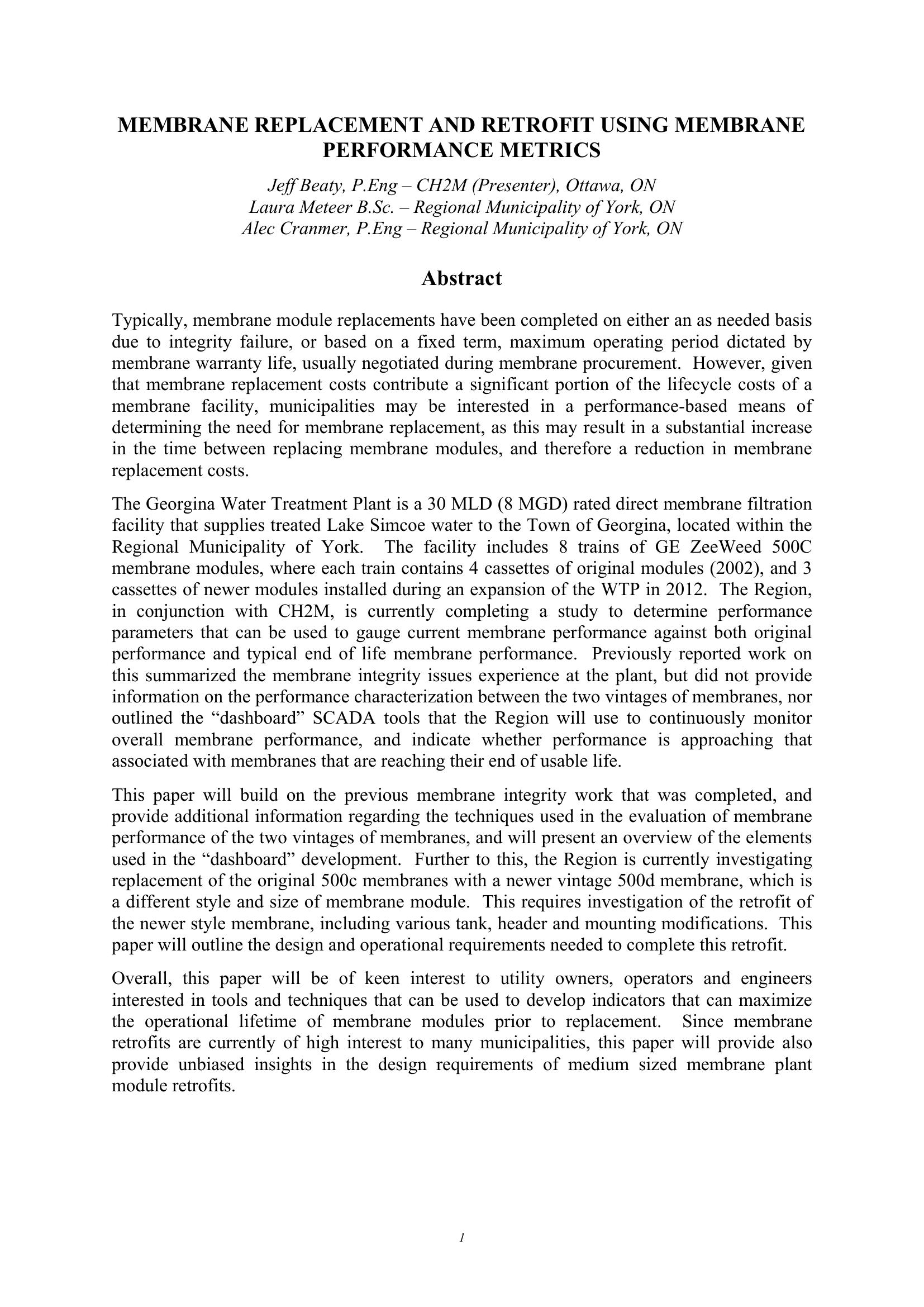 Overall, this paper will be of keen interest to utility owners, operators and engineers interested in tools and techniques that can be used to develop indicators that can maximize the operational lifetime of membrane modules prior to replacement. Since membrane retrofits are currently of high interest to many municipalities, this paper will provide unbiased insights in the design requirements of medium sized membrane plant module retrofits.