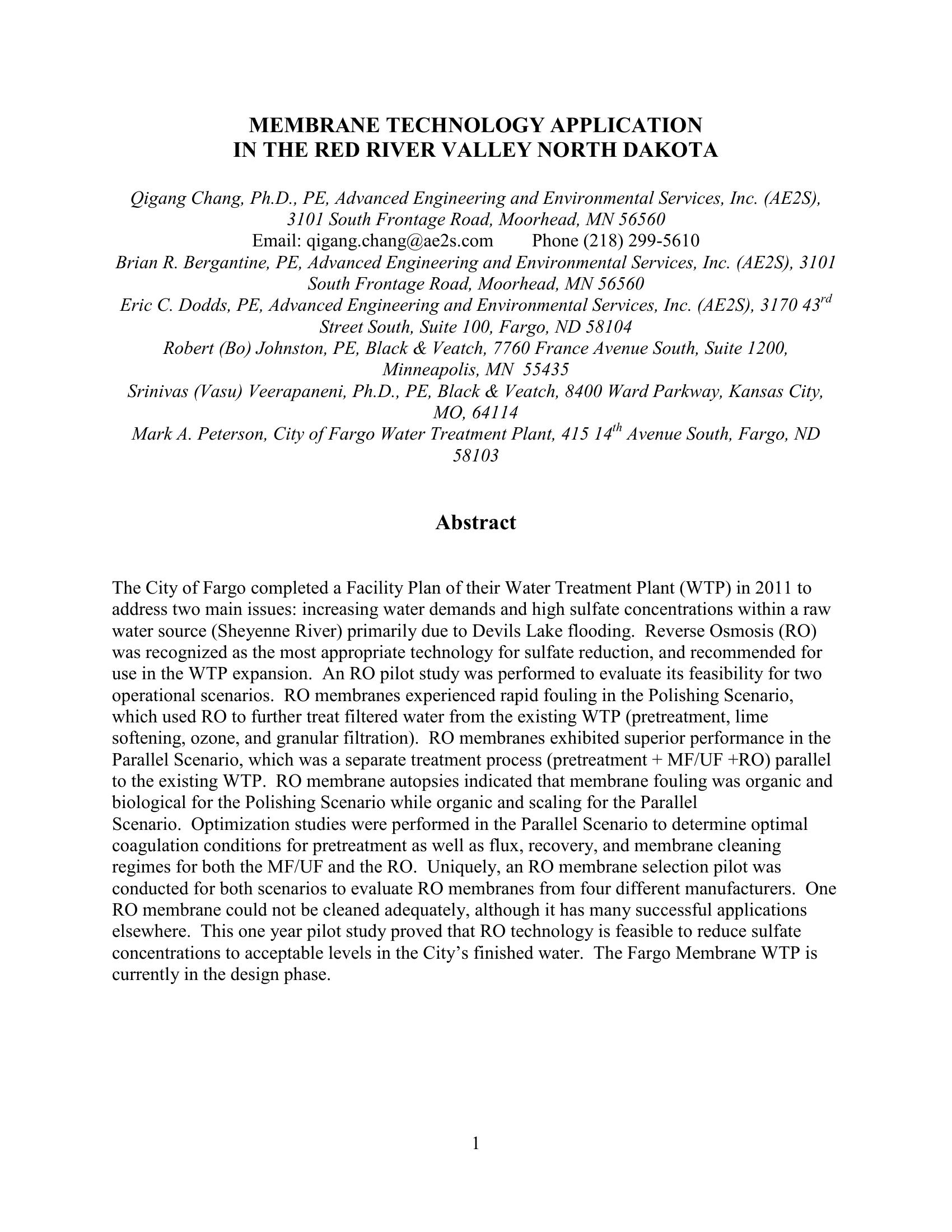 The City of Fargo completed a Facility Plan of their Water Treatment Plant (WTP) in 2011 to address two main issues: increasing water demands and high sulfate concentrations within a raw water source (Sheyenne River) primarily due to Devils Lake flooding. Reverse Osmosis (RO) was recognized as the most appropriate technology for sulfate reduction, and recommended for use in the WTP expansion. An RO pilot study was performed to evaluate its feasibility for two operational scenarios. An RO membrane selection pilot was conducted for both scenarios to evaluate RO membranes from four different manufacturers.