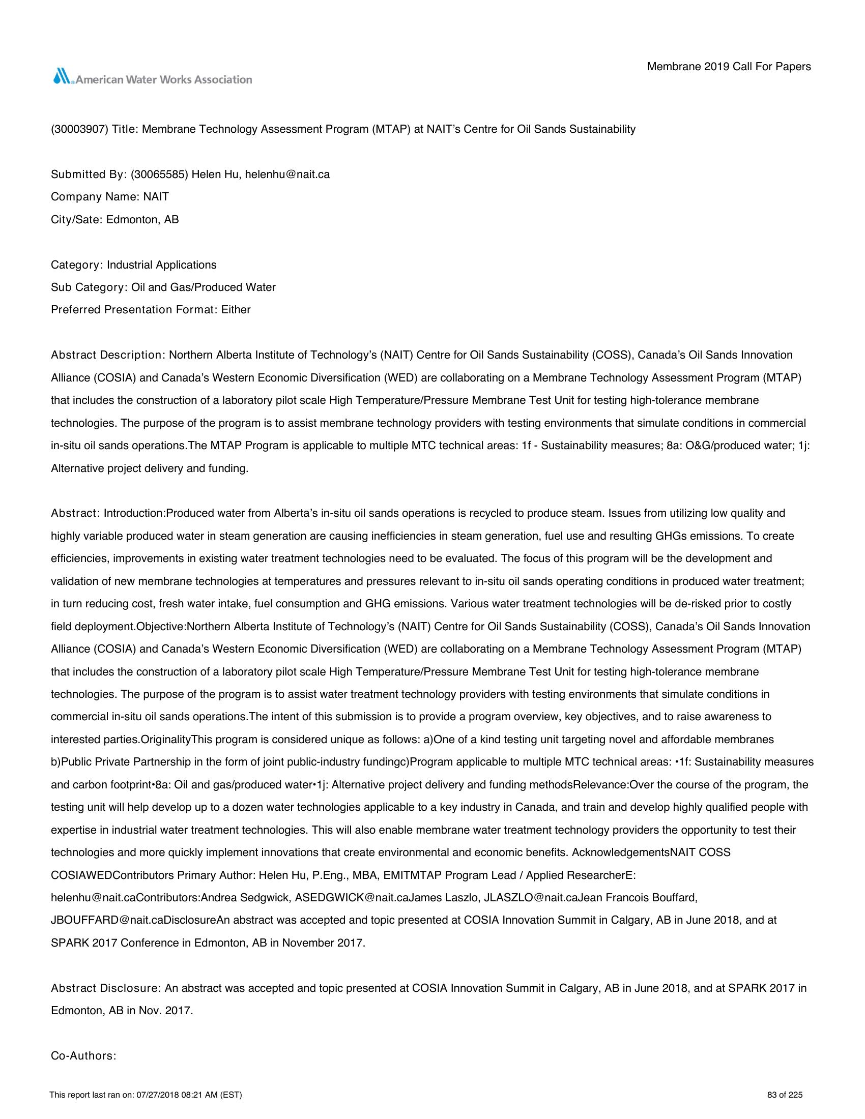 Northern Alberta Institute of Technology?s (NAIT) Centre for Oil Sands Sustainability (COSS), Canada?s Oil Sands Innovation Alliance (COSIA) and Canada?s Western Economic Diversification (WED) are collaborating on a Membrane Technology Assessment Program (MTAP) that includes the construction of a laboratory pilot scale High Temperature/Pressure Membrane Test Unit for testing high-tolerance membrane technologies. The purpose of the program is to assist membrane technology providers with testing environments that simulate conditions in commercial in-situ oil sands operations.The MTAP Program is applicable to multiple MTC technical areas: 1f – Sustainability measures; 8a: O&G/produced water; 1j: Alternative project delivery and funding.