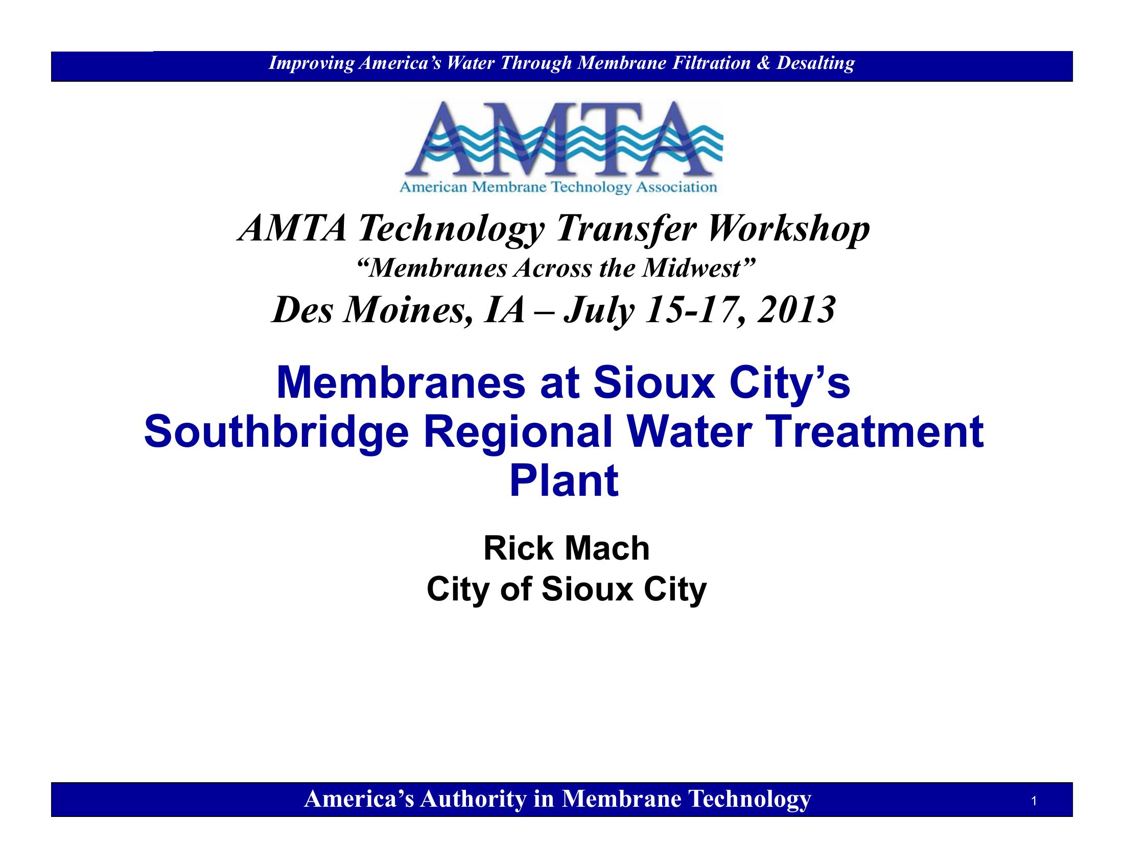 This PowerPoint discusses Membranes at Sioux City’s Southbridge Regional Water Treatment Plant and compares them to conventional treatment options.
